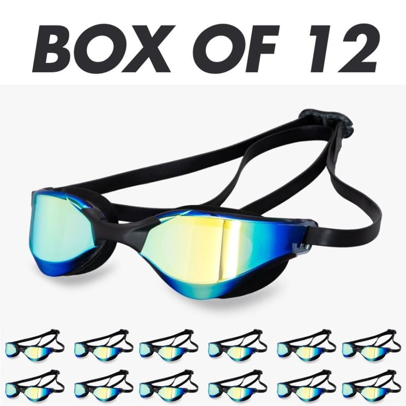 Box 12 x Black Racing Swimming Goggles: Twelve Pairs of silicone racing swim goggles, black with mirrored lens, includes three nose-pieces, hard plastic storage case, unisex, adults 8+, unbranded