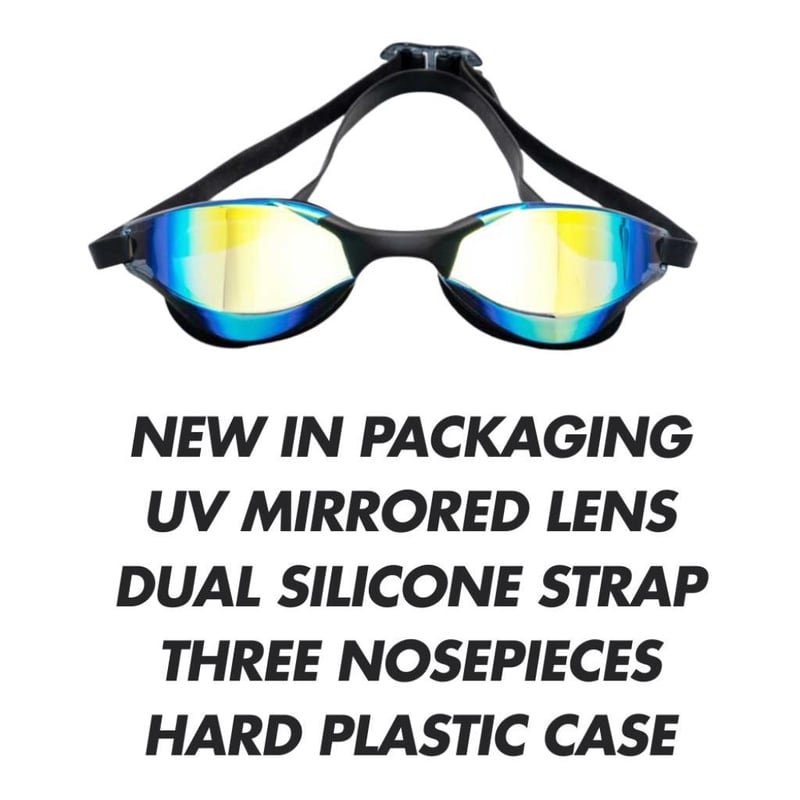Box 12 x Black Racing Swimming Goggles: Twelve Pairs of silicone racing swim goggles, black with mirrored lens, includes three nose-pieces, hard plastic storage case, unisex, adults 8+, unbranded