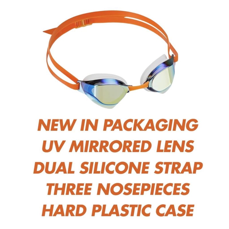 1 x Orange & White Racing/Training Swimming Goggles: One pair of silicone racing/training swim goggles, orange & white with mirrored lens, includes three nose-pieces, hard plastic storage case, unisex, adults 8+, unbranded