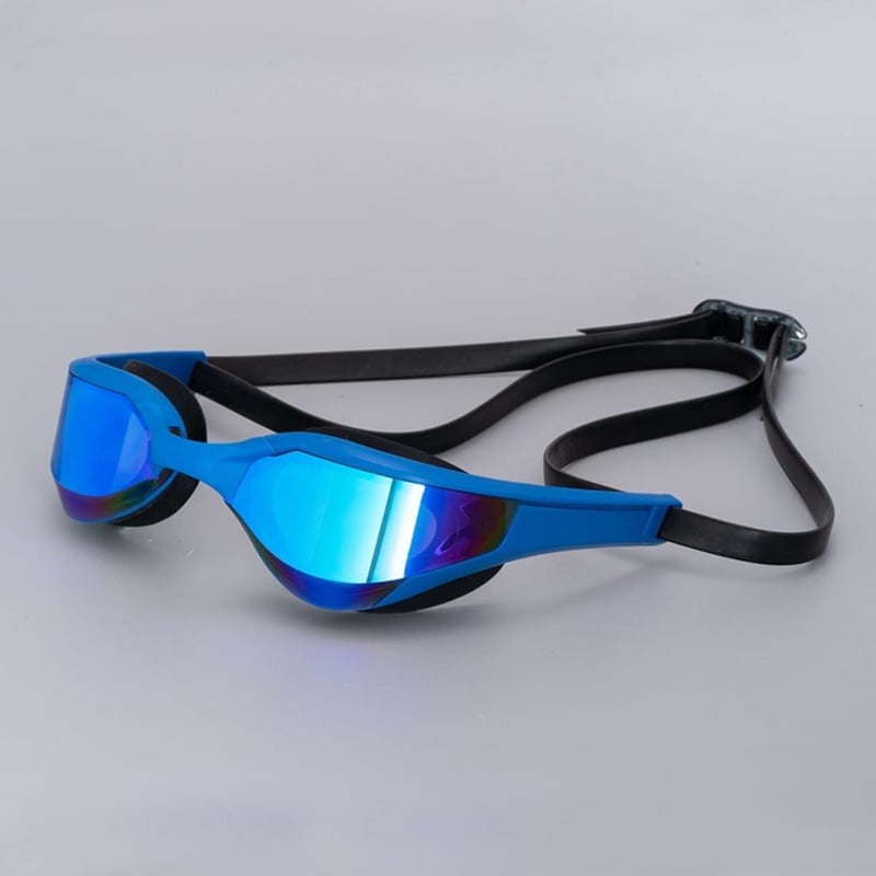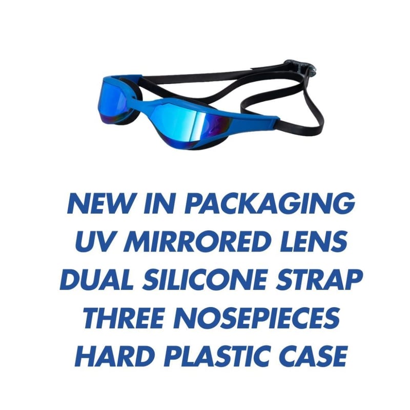 1 x Blue Racing Swimming Goggles: One pair of silicone racing swim goggles, blue with mirrored lens, includes three nose-pieces, hard plastic storage case, unisex, adults 8+, unbranded
