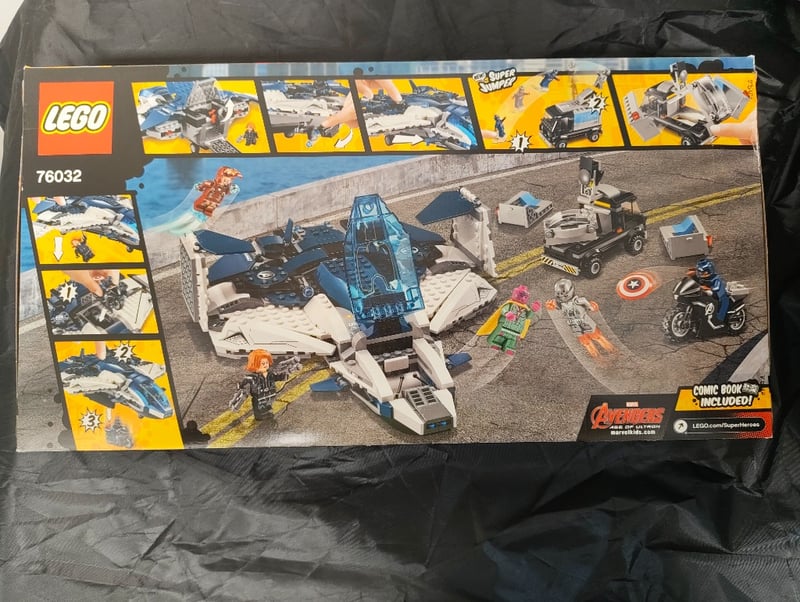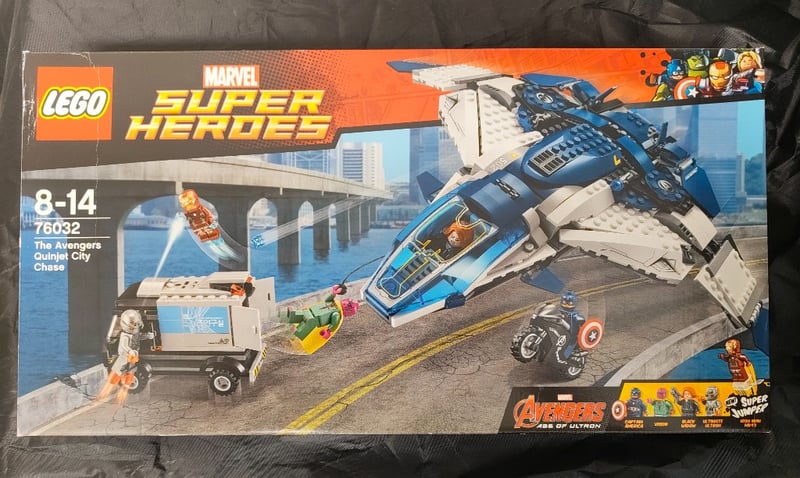 LEGO MARVEL SUPER HEROES "THE AVENGERS QUINJET CITY CHASE" SET 76032Complete Lego Marvel Super Heroes Construction Set 76032 Featuring The Avengers Quinjet With Blue And White Colour Scheme, Accompanying Ground Vehicles Including A Truck And Motorcycle, Multiple Minifigures, And Accessories. Set Includes Instruction Manual And Original Packaging Showing Age 8-14 Suitability.Condition: Good - Refer To Images584522+32