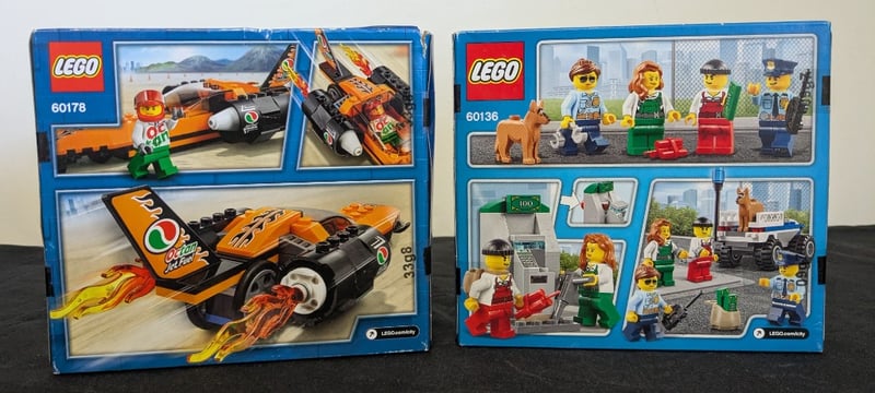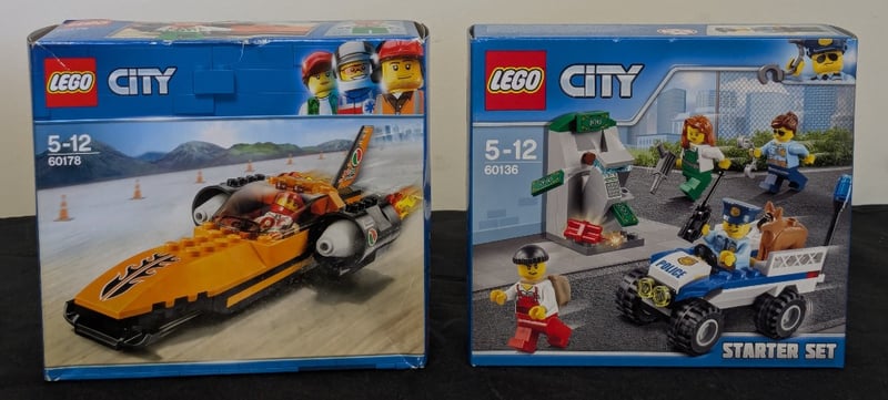 LEGO CITY VINTAGE SET COLLECTION - SETS 60178 & 60136Vintage Lego City Dual Set Lot Featuring Set 60178 (Orange Jet-Powered Racing Vehicle With Desert Launch Pad) And Set 60136 (Police Starter Set With Minifigures, Patrol Vehicle, And Accessories). Both Sets Retain Original Blue Packaging With Visible Imagery And Specifications. Set 60178 Displays Jet Racer With Flame Decals And Launch Mechanics; Set 60136 Includes Diverse Minifigure Collection With Police Officer, Civilian Figures, And Brown Dog Accessory. Packaging Shows Age-Appropriate Wear ConCondition: Good - Refer To Images584522+159