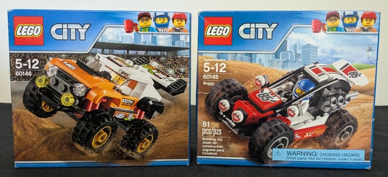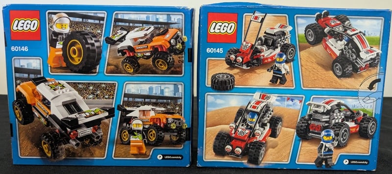 LEGO CITY STUNT VEHICLES - MONSTER TRUCK AND BUGGY SET BUNDLEPair Of Lego City Construction Sets Featuring Two Distinct Stunt Vehicles - Set 60146 (Orange And White Monster Truck With Yellow-Trimmed Wheels) And Set 60145 (Red And White Buggy, 81 Pieces). Both Sets Remain In Original Sealed Packaging With Intact Box Artwork Showing Full Vehicle Assembly And Minifigure Details. Manufactured To Lego Specifications With Appropriate Age Guidance (5-12 Years). Sets Depict Off-Road Terrain-Racing Themes With Detailed Vehicle Designs And Pit Crew Minifigures.Condition: Good - Refer To Images584522+102