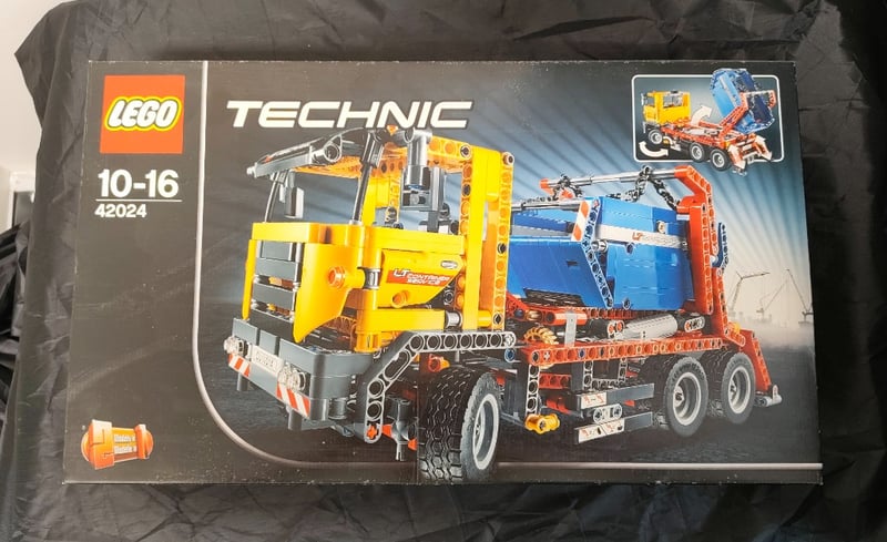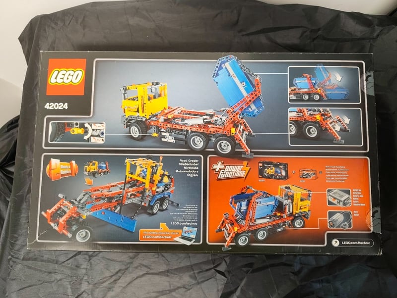 Lego Technic Set 42024 Featuring A Motorised Container Truck With Extendable Pneumatic Arm And Articulated Loading Mechanism. Boxed Set Designed For Ages 10-16, Includes Yellow Cab Unit, Orange Chassis Frame, Blue Container, And Power Functions Motor Components. Multi-Configuration Model Capable Of Assembly Into Road Grader, Container Truck, And Stationary Loading Apparatus Variants.