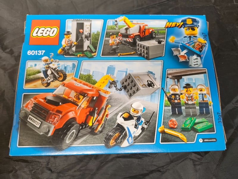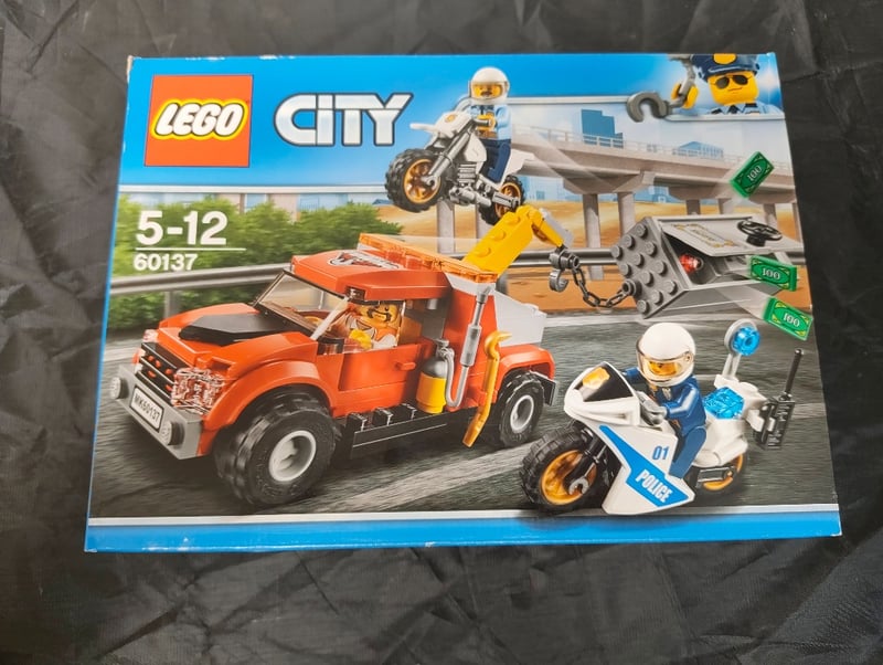 Lego City Set 60137 Featuring An Orange And Yellow Tow Truck With Articulated Crane Arm, Police Motorcycle With Blue And White Livery, Minifigures Including Construction Worker And Officer, Building Elements, And Accessories. Suitable For Ages 5-12. Original Factory-Sealed Packaging With Intact Graphics And Structural Integrity.