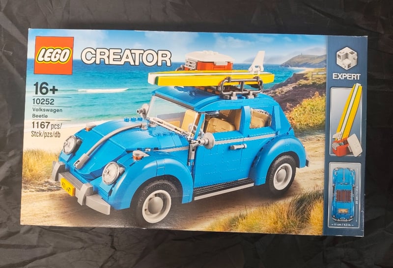 Lego Creator Expert Series Volkswagen Beetle Building Set (10252) Featuring 1167 Pieces. The Set Includes A Detailed Blue Vw Beetle Model With Opening Doors, Functional Steering Wheel, And Removable Roof Panels. Includes A Yellow Surfboard Accessory And Luggage Rack Mounted On Top. The Model Displays Authentic Beetle Proportions With White-Wall Tyres, Chrome Details, And Tan Interior. Suitable For Ages 16 And Above