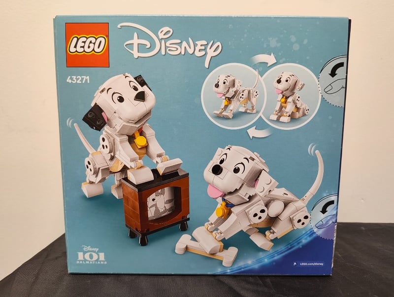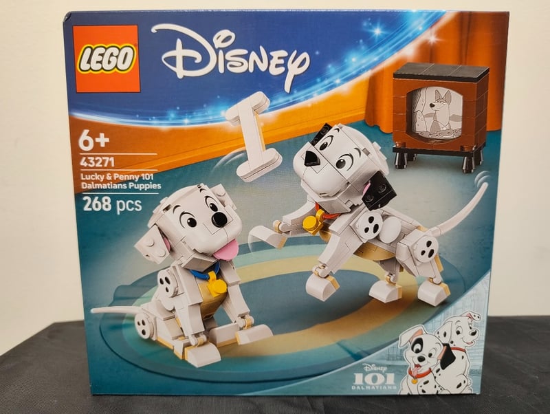 Lego Disney Set 43271 Featuring Buildable Lucky And Penny Dalmatian Puppy Figures With Articulated Joints, Rotating Heads, And Poseable Limbs. Includes Vintage Television Accessory With Printed Screen Detail And Decorative Stand Element. Complete 268-Piece Construction Set Designed For Ages 6+. Figures Showcase Characteristic Spotted White Pelts, Black Facial Markings, And Golden Collar Accents, Authentically Capturing The Beloved Disney Characters.