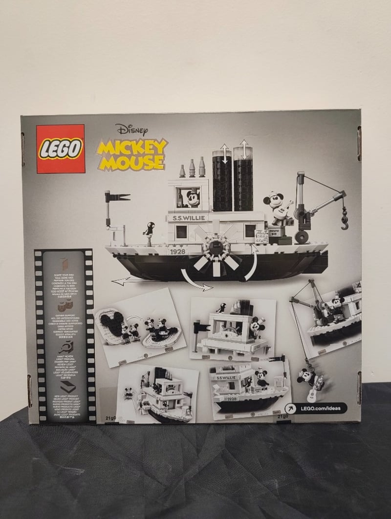 Lego Ideas Disney Mickey Mouse Steamboat Willie (Set 21317) Featuring Buildable Iconic 1928 Steamboat With Detailed White Superstructure, Black Smokestack, Functional Paddle Wheel, And Working Anchor Crane. Includes Two Mickey Mouse Minifigures In Classic Design. Displayed Packaging Shows Comprehensive Instruction Details And Multiple Build Configurations. Collectible Disney Nostalgia Piece Celebrating Animation Heritage And Vintage Steamboat Aesthetics.