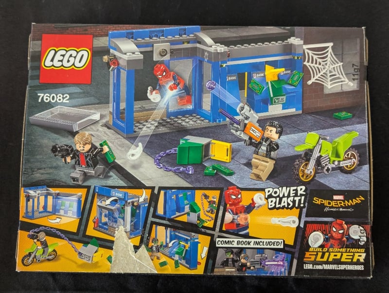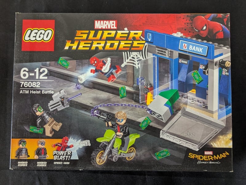LEGO MARVEL SUPER HEROES ATM HEIST BATTLE SET 76082Lego Marvel Super Heroes Set 76082 Featuring Spider-Man Homecoming Theme. Includes Buildable Bank Structure With Opening Entrance, Motor-Driven Getaway Motorcycle With Lime-Green Accents, Atm Heist Scenario With Projectile Launcher, And Three Minifigures (Spider-Man, Masked Robber Variants). Features Power-Blast Action Elements, Translucent Spider Web Decoration, Currency Brick Elements, And Included Comic Book. Designed For Ages 6-12.Condition: Good - Refer To Images584525+98
