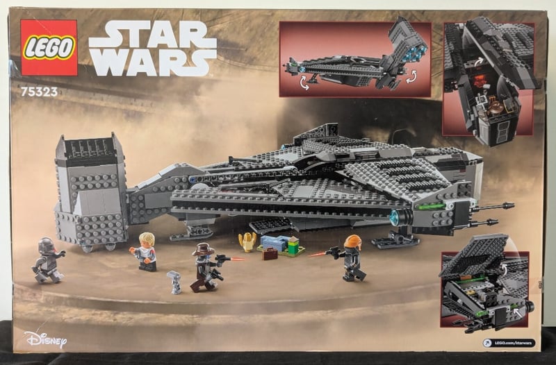 Lego Star Wars Set 75323 "The Justifier" Features A Detailed Buildable Starship With Opening Cockpit Canopy, Deployable Landing Gear, And Rotating Sensor Dish. Includes Five Minifigures (Cad Bane, Boba Fett, Fennec Shand, And Two Other Characters) With Weapons And Accessories. The Set Showcases An Impressive Grey And Black Color Scheme With Authentic Star Wars Design Elements, Movable Wings, And Intricate Detailing Throughout The Hull Structure.