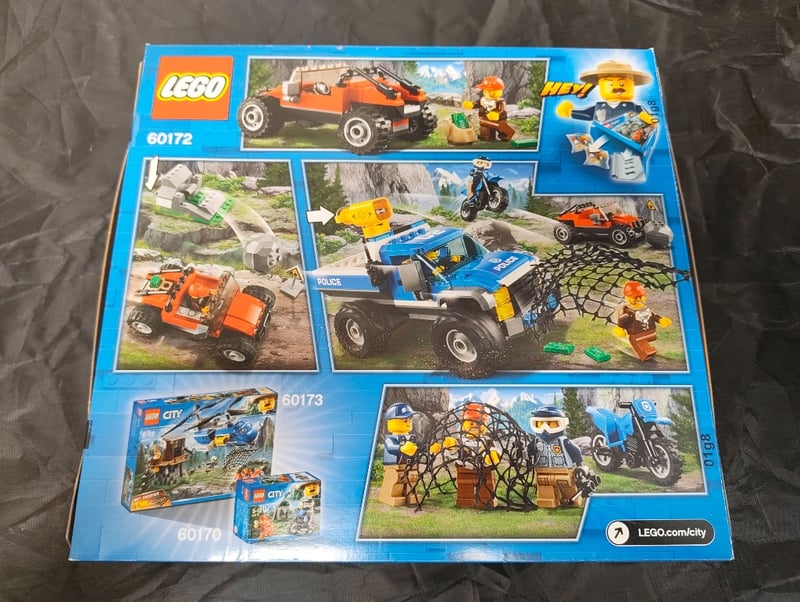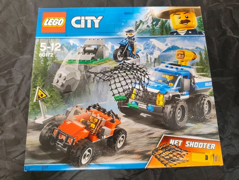 Lego City Set 60172 Featuring A Police Chase Scenario With An Orange All-Terrain Quad Vehicle, Blue Police Truck With Net Shooter Mechanism, Motorcycle, And Minifigures. Complete With Rocky Terrain Pieces, Trees, And Mountain Backdrop. Age Rating 5-12 Years. Excellent Construction And Playability.