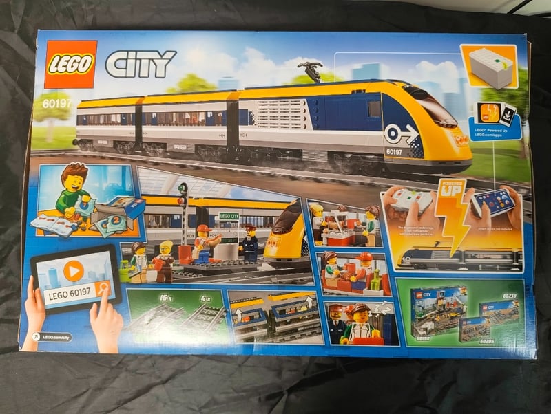 Lego City Passenger Train Set 60197 Featuring A Motorized Yellow And Black Passenger Train With Power Functions Battery Box And Remote Control. The Comprehensive Set Includes Track Sections, A Detailed Station Platform With Accessories, And Multiple Minifigures. Includes Interactive Lego Powered Up App Compatibility. Original Packaging In Good Condition With All Visible Components Intact. Age Range 6-12 Years. Complete With Instruction Manual Visible On Packaging