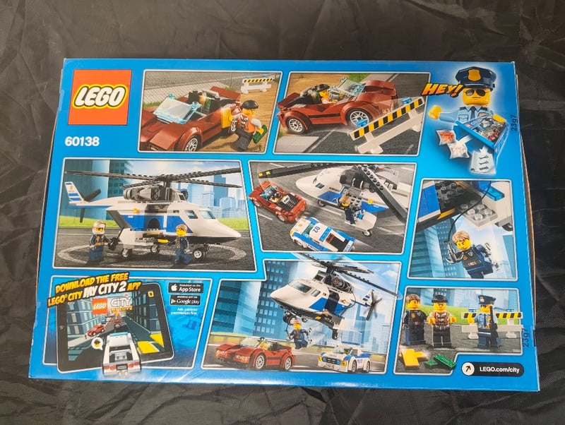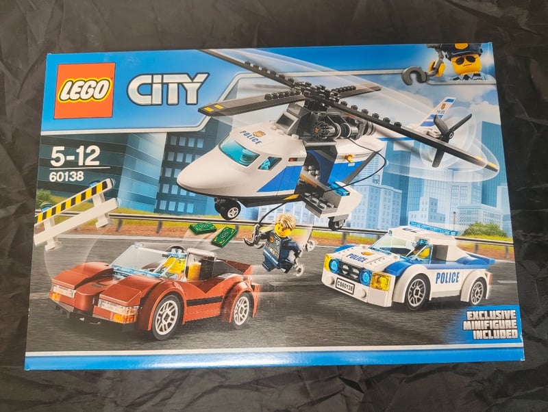 Lego City Set 60138 Featuring A Police Helicopter Pursuit Theme With A White And Blue Police Helicopter, White And Blue Police Car, Red Sports Car, And Minifigures. The Set Includes An Exclusive Minifigure And Includes Instruction Manual. Original Retail Packaging With Age Recommendation 5-12 Years