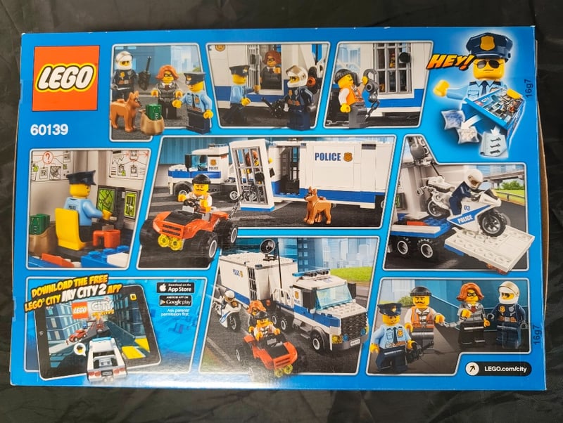 Lego City Set 60139 Featuring A Police Mobile Command Centre With Transport Truck, Police Motorcycle, And Four Minifigures Including Officers And A Criminal Character. Includes Detailed Accessories Such As Traffic Cones, Money, And Equipment. Designed For Ages 6-12. Original Retail Packaging With Instruction Manual Visible On Reverse.
