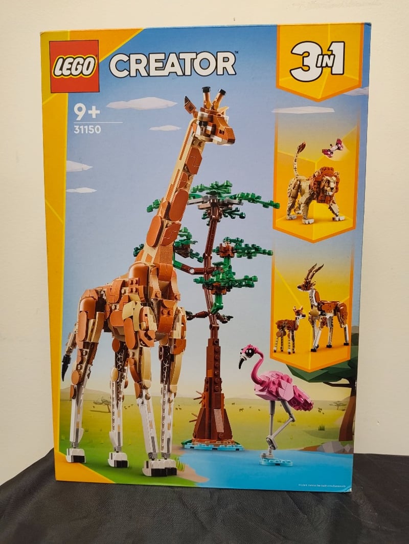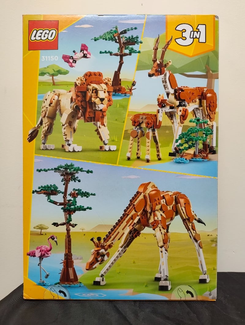 Lego Creator 3 In 1 Set 31150 Featuring Buildable African Savanna Animals. The Set Includes A Giraffe As The Primary Model, With Alternative Builds For A Lion And Flamingo. Includes Detailed Acacia Tree And Water Feature Base Elements. Age Rating 9+. Original Retail Packaging In Good Condition With Minor Wear To Box Edges. Complete Set Appears Unopened Or Minimally Assembled Based On Box Presentation.