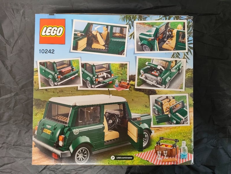 Lego Creator Expert Set 10242 Featuring A Detailed Mini Cooper Model With 1077 Pieces. This Advanced Building Set (16+) Includes A Fully Articulated Green And White Classic Mini Cooper With Opening Doors, Functional Trunk, Detailed Interior With Tan Seats, Working Steering Wheel, And Authentic License Plate. The Set Includes A Picnic Basket With Food Accessories And Checkered Blanket. Displays Excellent Detail With Chrome-Effect Parts, Realistic Wheels, And Scale-Appropriate Proportions