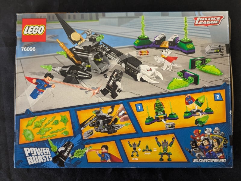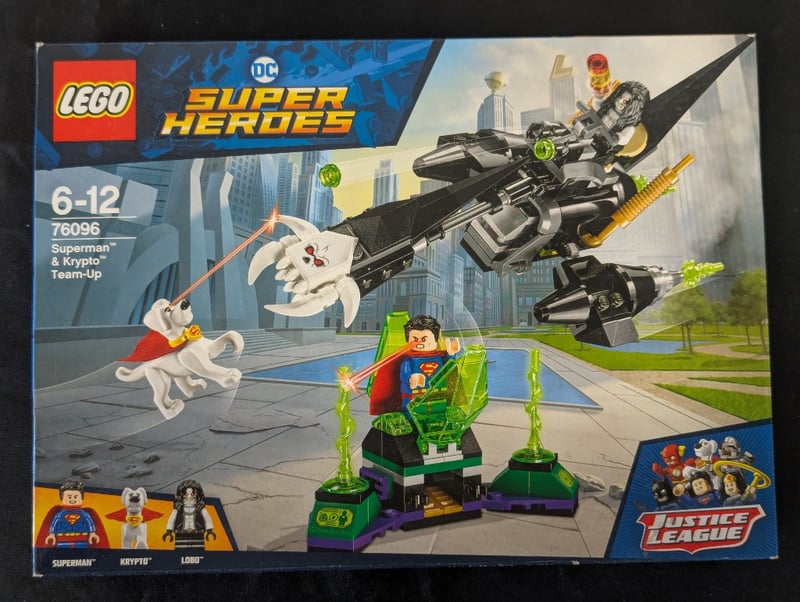 Lego Dc Super Heroes Set 76096 Featuring Superman And Krypto In A Dynamic Team-Up Scenario. Includes Minifigures Of Superman, Krypto The Dog, And Lex With A Detailed Black Aircraft Featuring Lime-Green Accents And Rotating Elements. The Set Comprises Multiple Build Components Including Kryptonite Power-Up Pieces And A Cityscape Backdrop. Original Packaging Shows Age-Appropriate Rating 6-12 Years