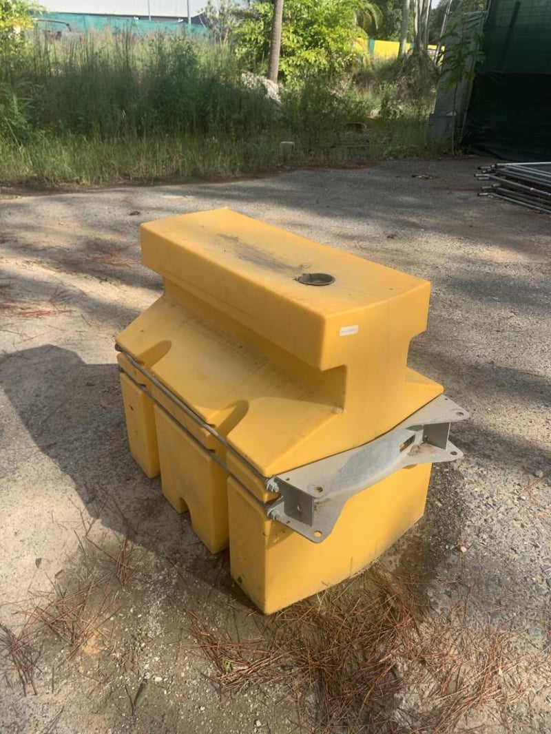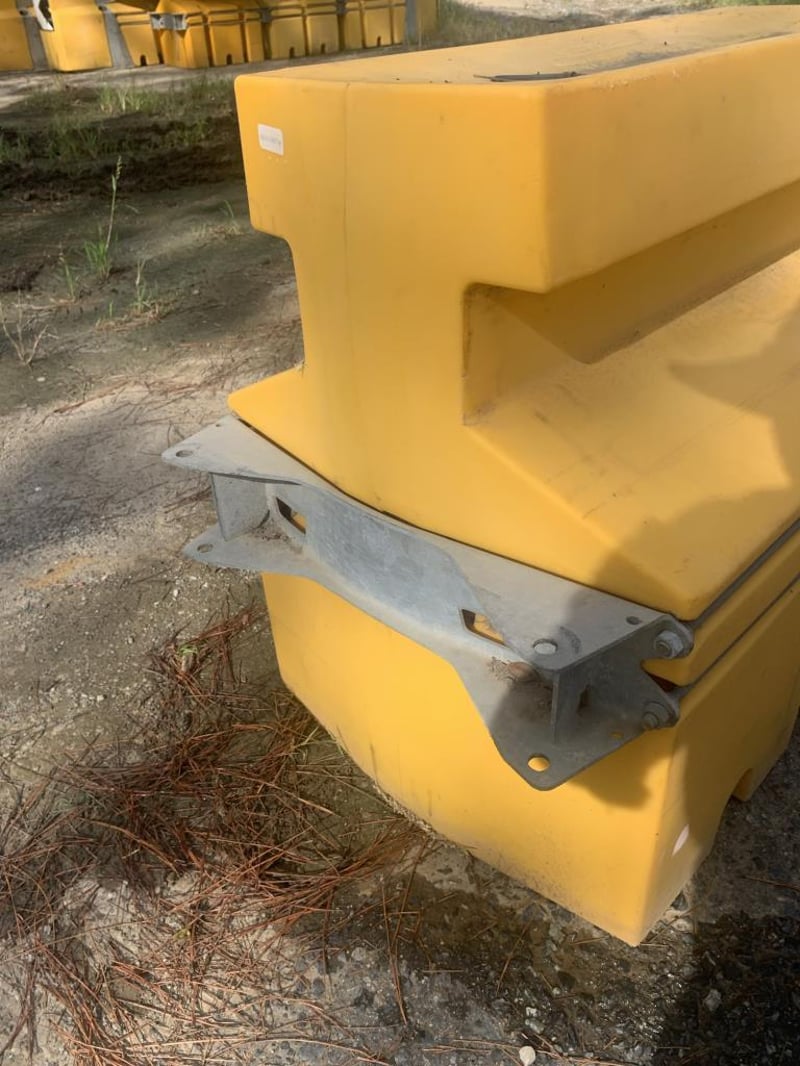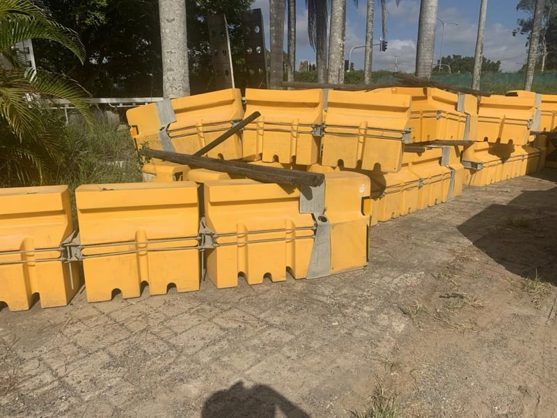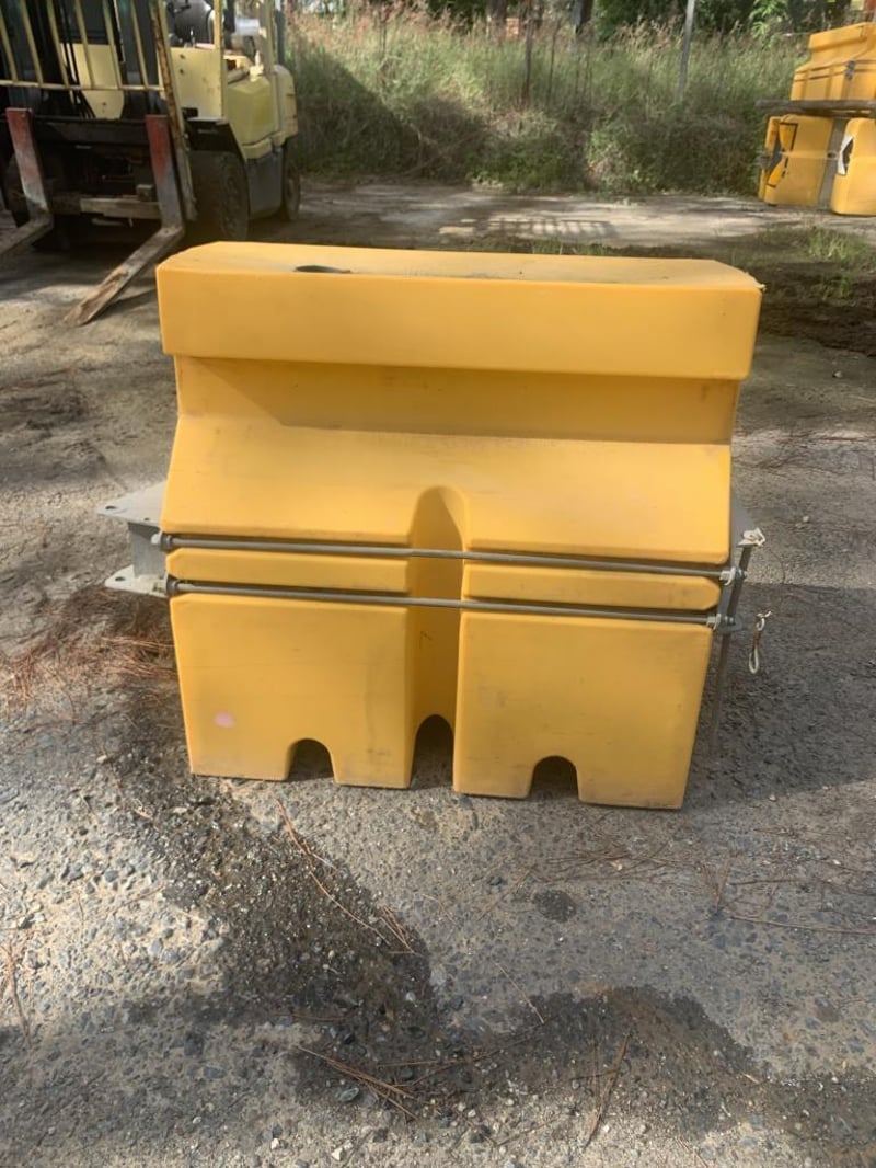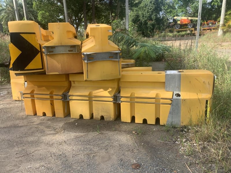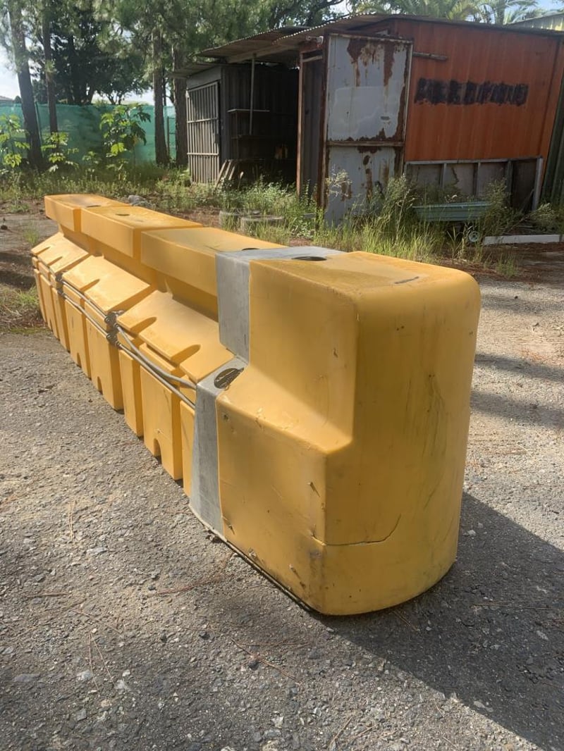 Plastic Water Filled Road Safety Barriers (Qty: 50)Notes / Extras: Yellow plastic road safety barriers, modular linking system, galvanised Metal connection brackets, stackable design, water fillable ballast system.