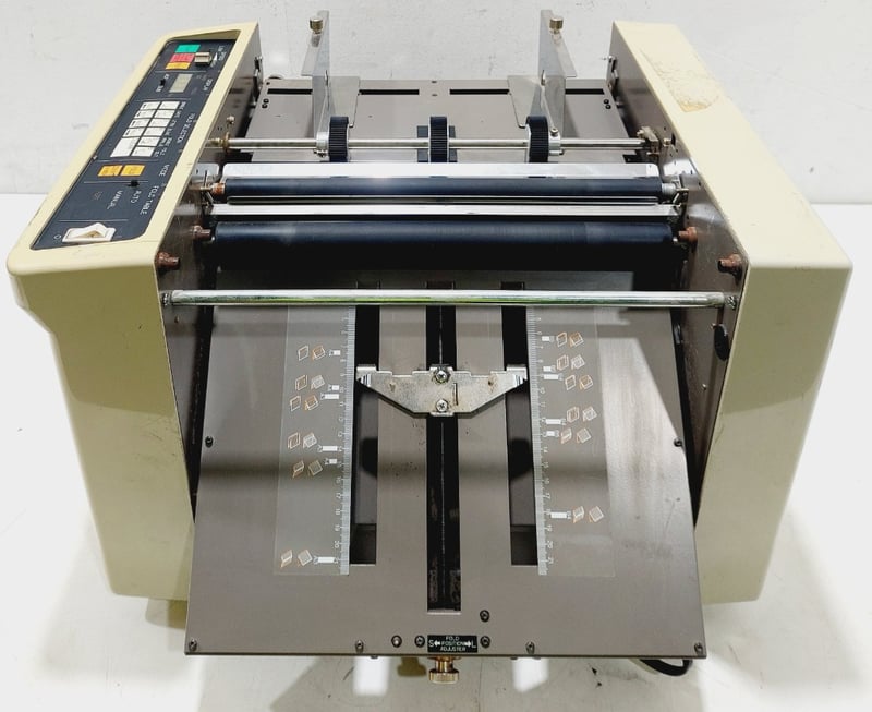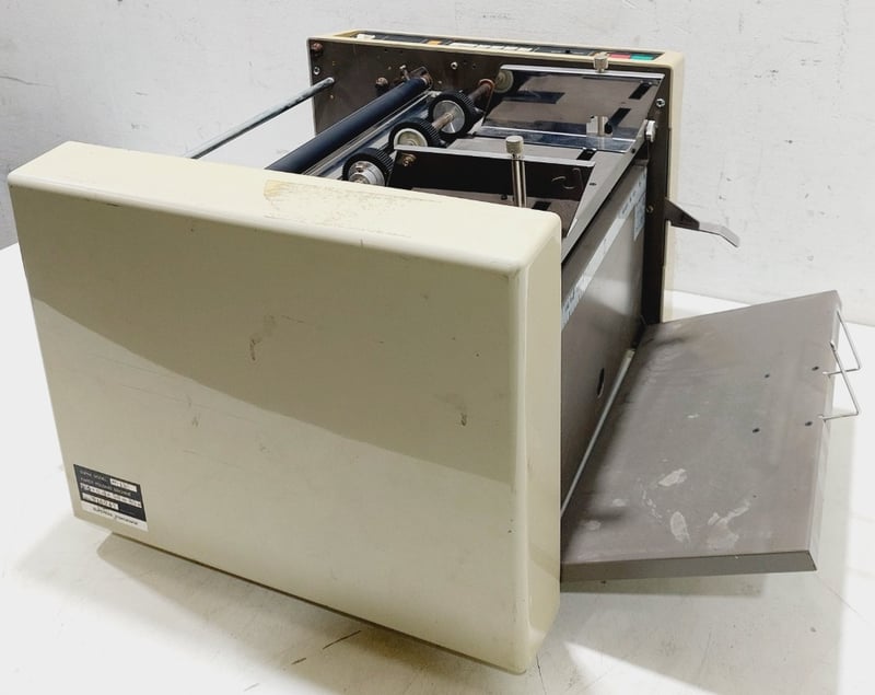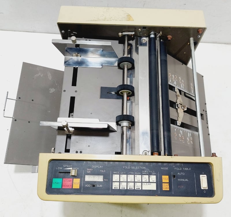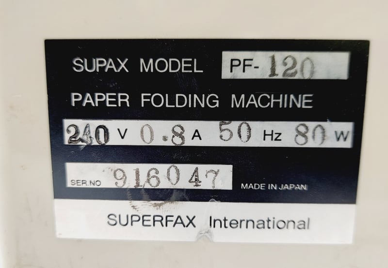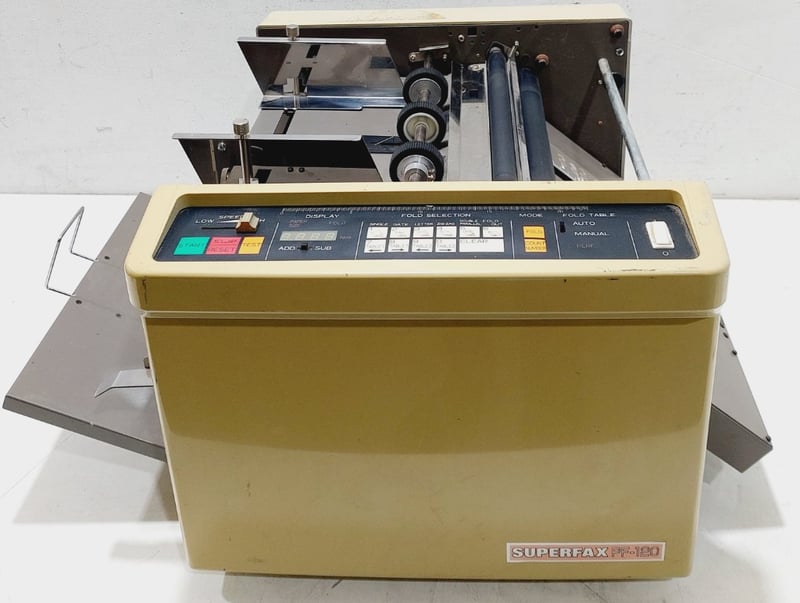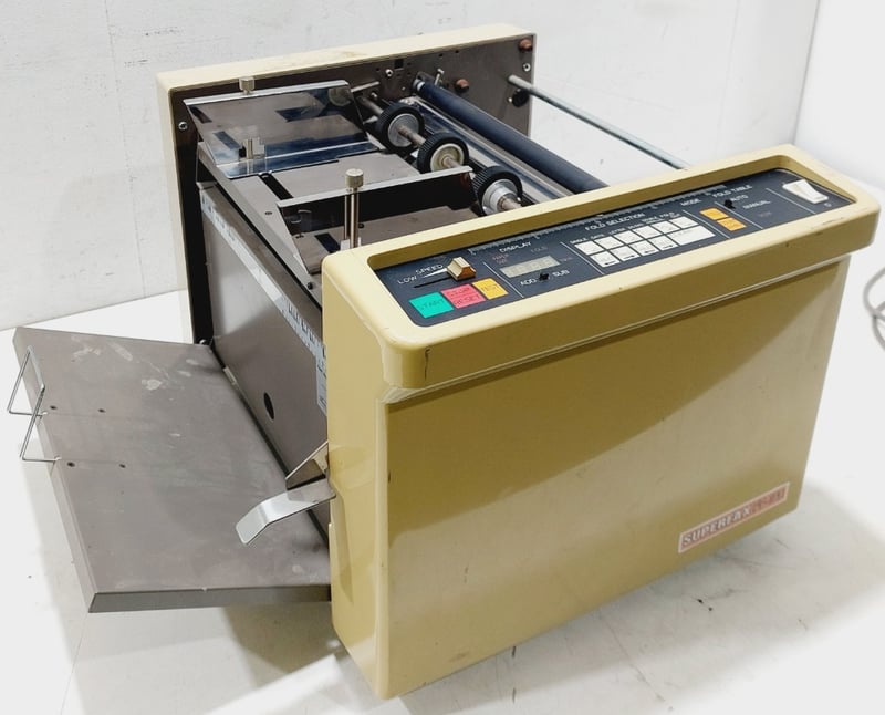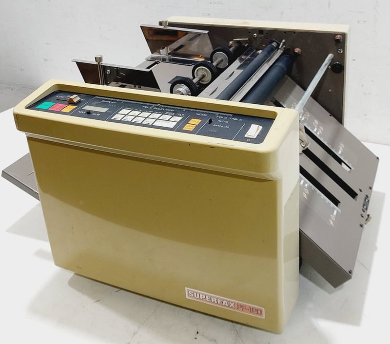 Superfax PF-440 paper folding machine. Designed for high-volume office or printshop environments, capable of handling paper sizes up to A3 and folding up to 9,000 sheets per hour.