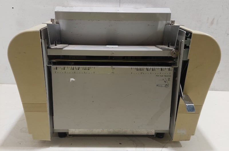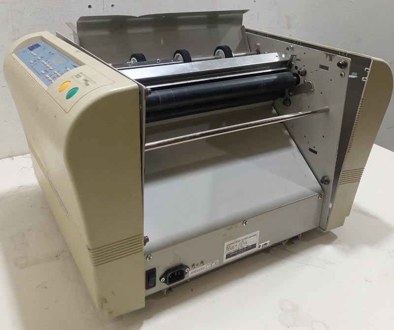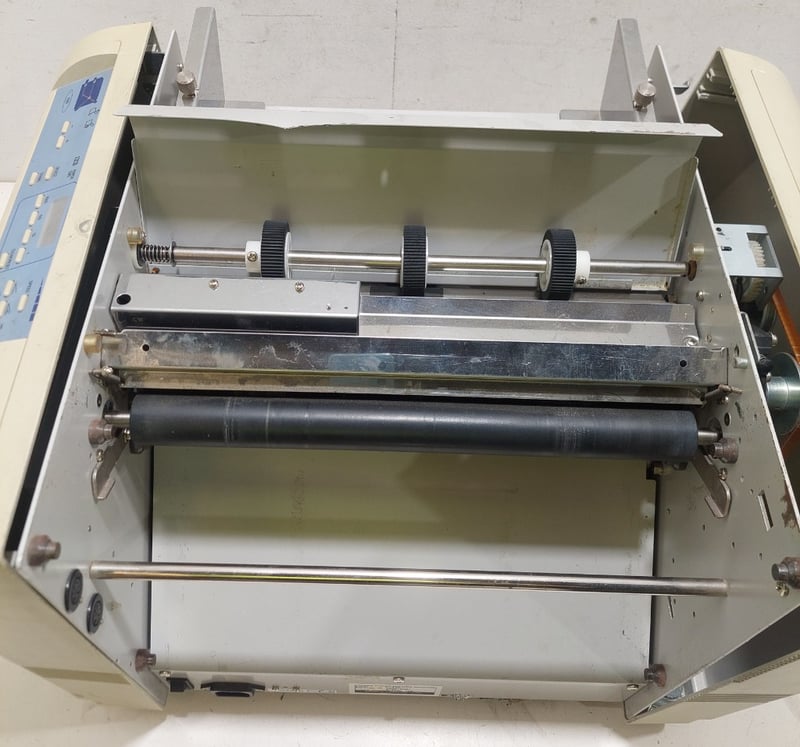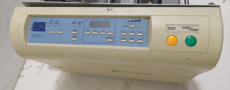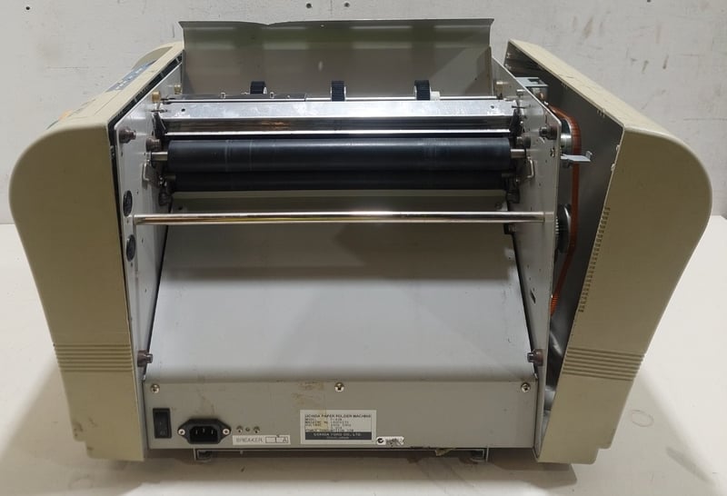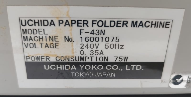 Automatic paper folding machine, Uchida brand.Dimensions 35cm H, 53cm W, 47cm D.Model: F-43N.Serial no: 16001075.Note: inspection is highly recommended, item is untested, signs of wear, may be missing parts. item untested and signs of wear.