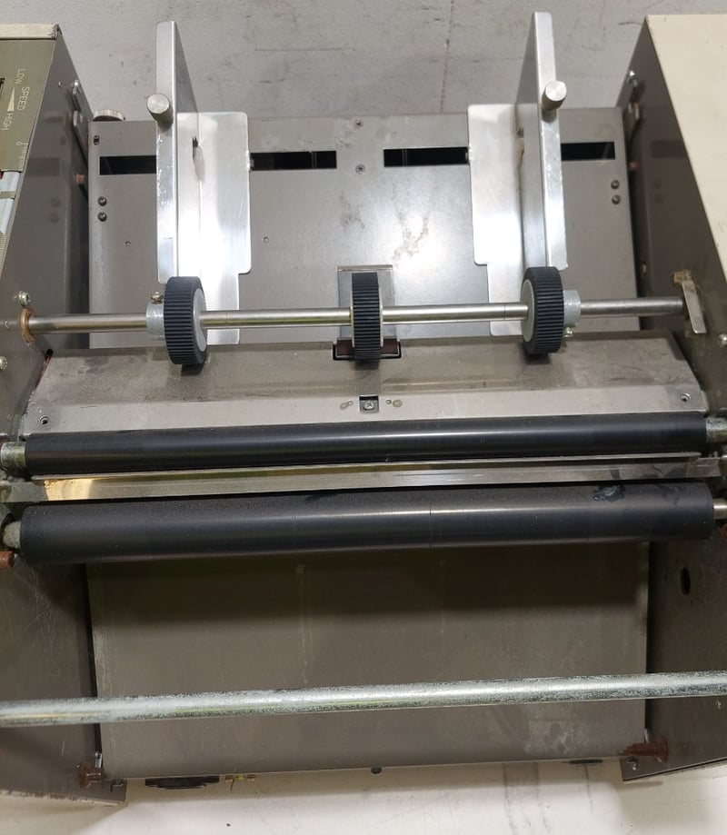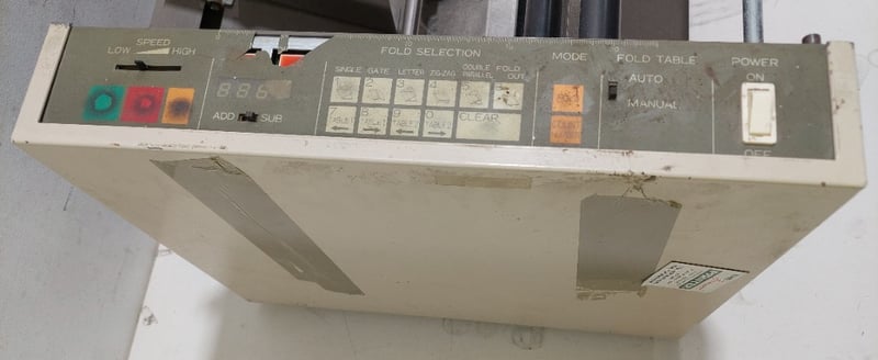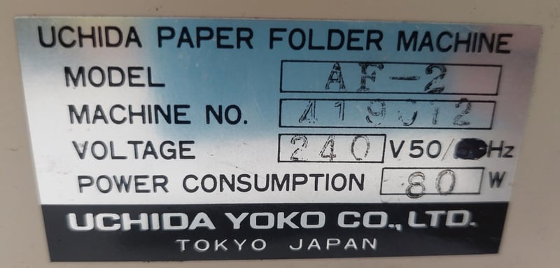 Automatic paper folding machine, Uchida brand.Dimensions: 85cm H, 48cm W,, 41cm D.Model: AF-2Note: inspection is highly recommended, item is untested, signs of wear, may be missing parts. item untested and signs of wear.