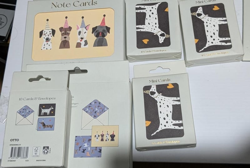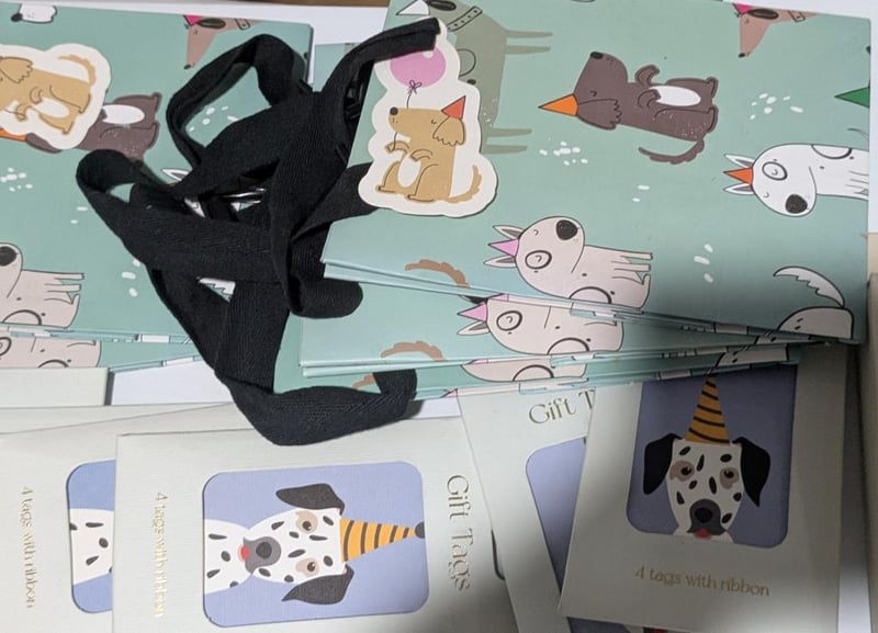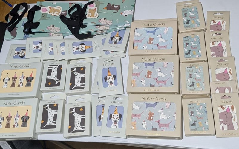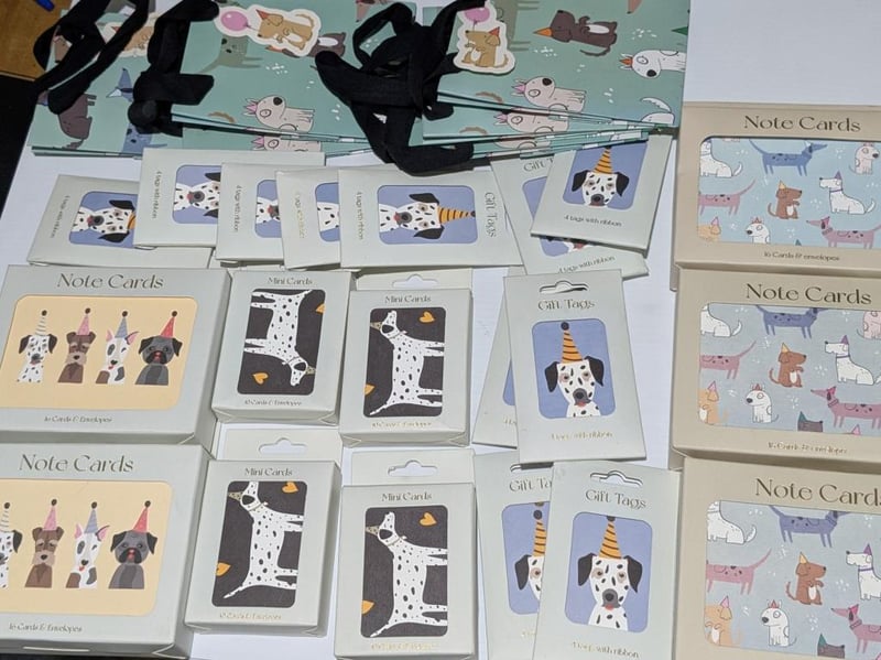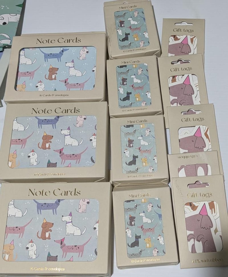 Dog themed $200 value note cards, mini cards, gift tags & gift bags, sold as lot