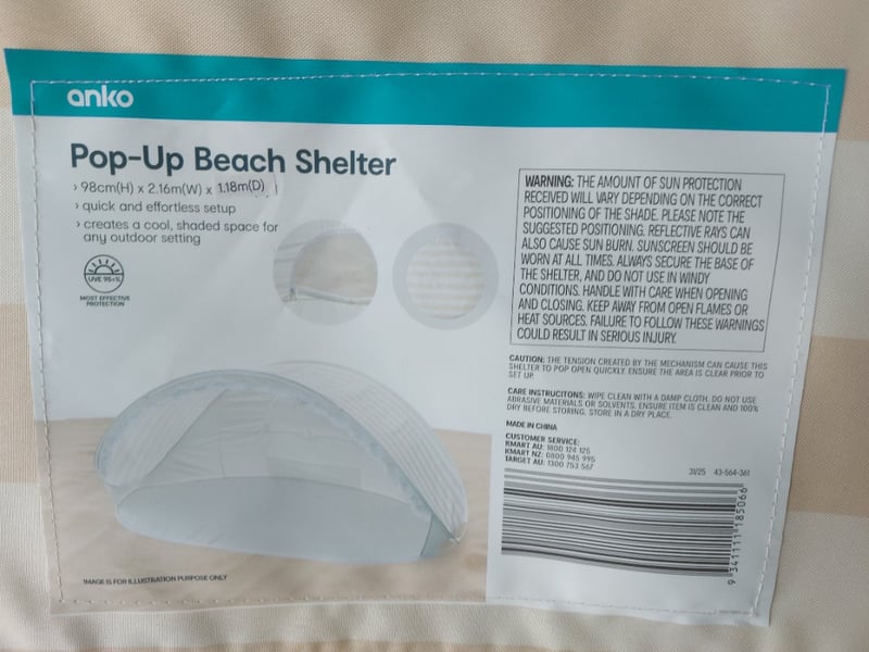 Anko Pop up Beach Shelter, DIMENSIONS: 98 cm (H), 2.16m (W), 1.18 m (D)