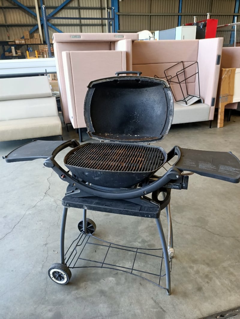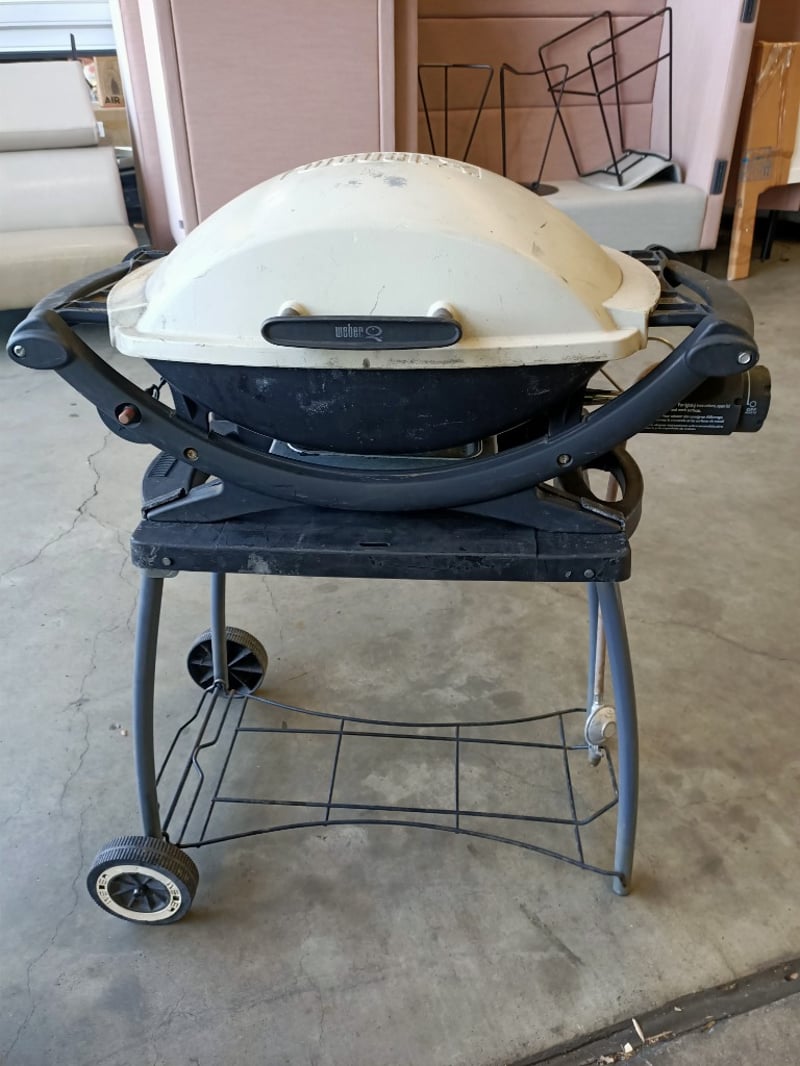Weber Q series barbecue grill with stand. Features a black powder-coated steel body with white ceramic lid & integrated handles. Includes a removable porcelain-coated cooking grate and drip tray. Mounted on a sturdy steel cart base with collapsible legs, bottom shelf storage rack, and wheeled mobility. Grill shows signs of age and use with visible surface discolouration and weathering. Lid has scratches and wear. Cart frame exhibits rust patina consistent with outdoor storage. All mechanical components appear functional.