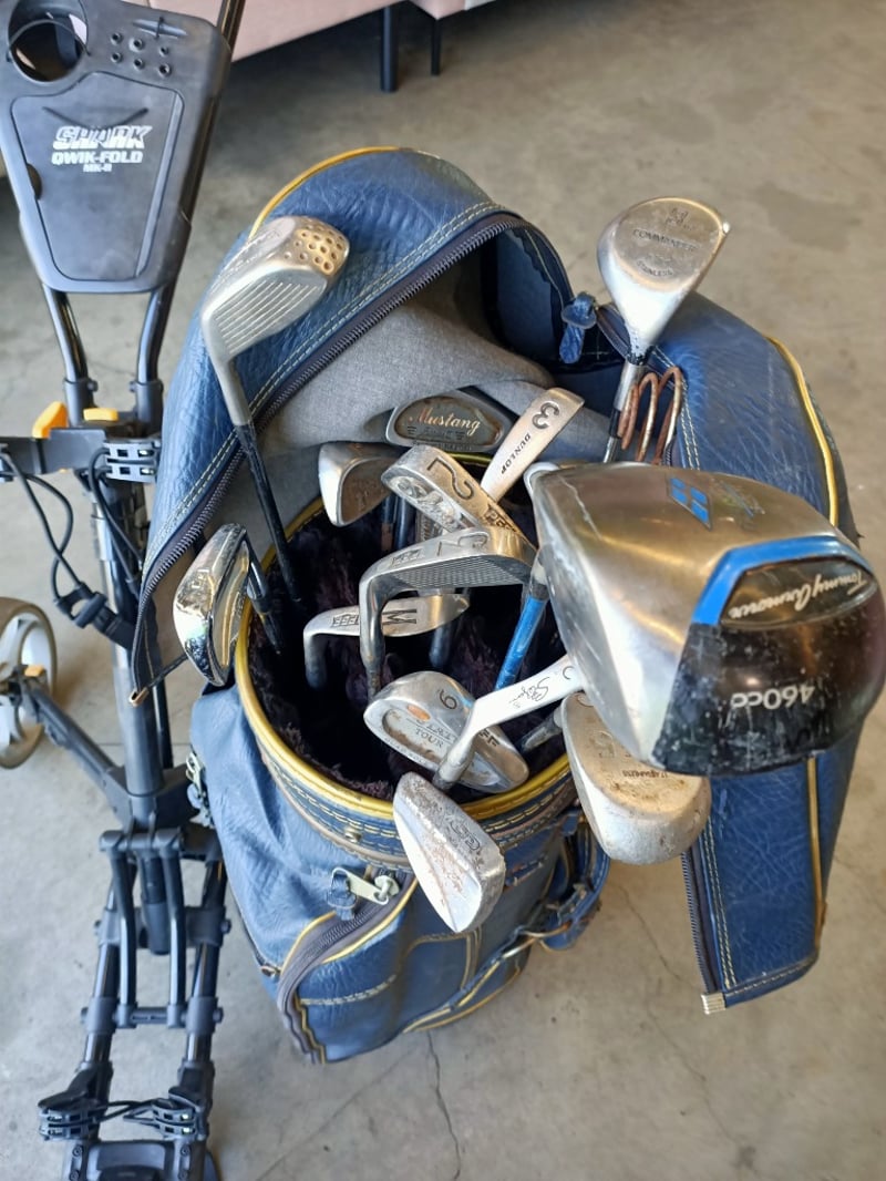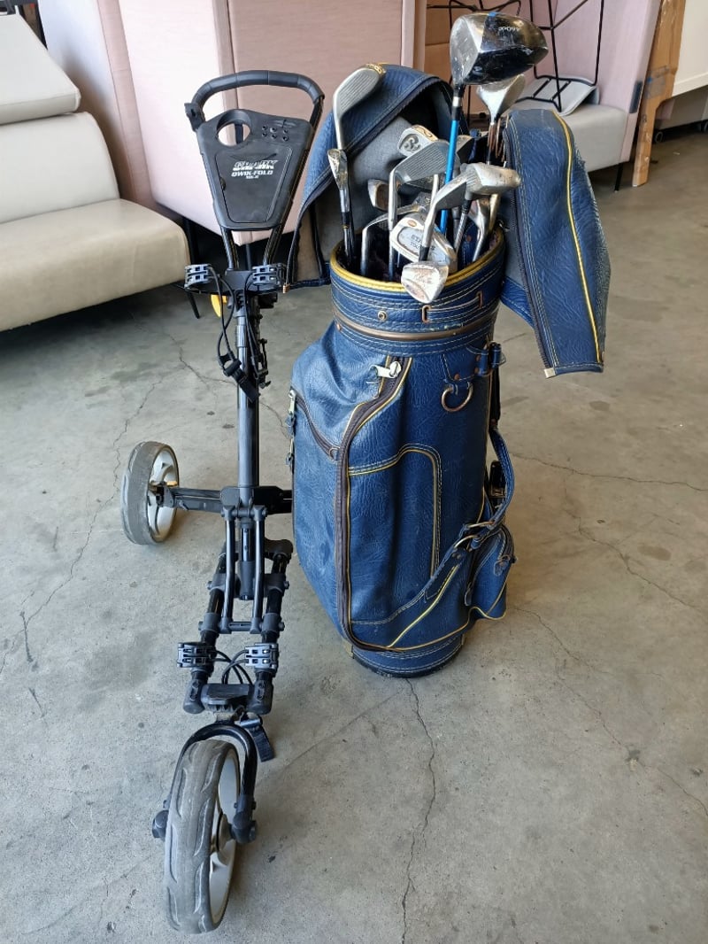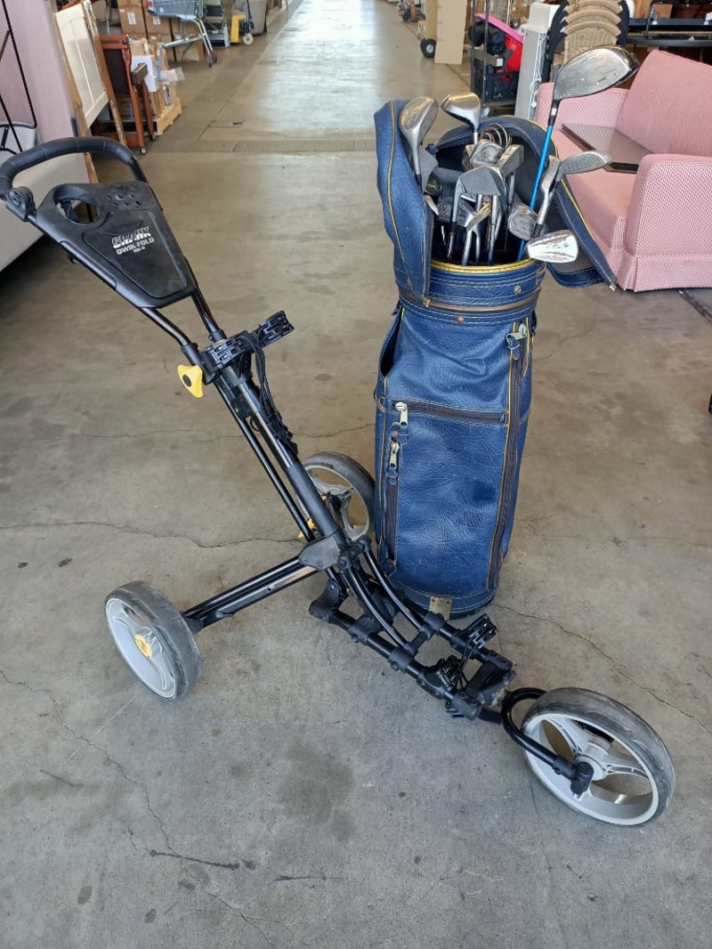 Golfing Gear Including Shark Qwik-Fold MK-II Cart, Assorted Golf Clubs & Golf Bag SOLD AS LOT