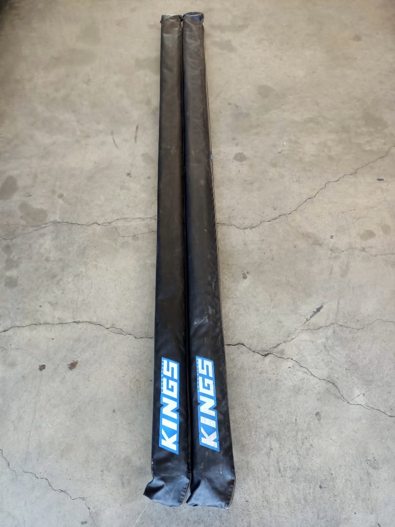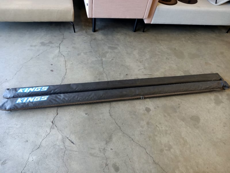 Pair of Kings roof rack side awnings with protective carry bags. Black powder-coated steel construction featuring blue "KINGS" branding. Each rail measures approximately 1.5 metres in length.