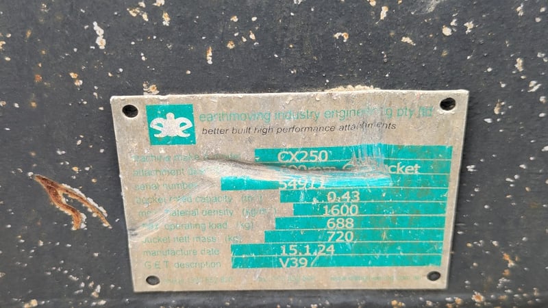 Excavator Bucket Make: EIE Type: CX250 Teeth: Pin Size: 9 cm BTE: 33 cm Bucked size: approx Width: 63 cm Depth: 175 cm