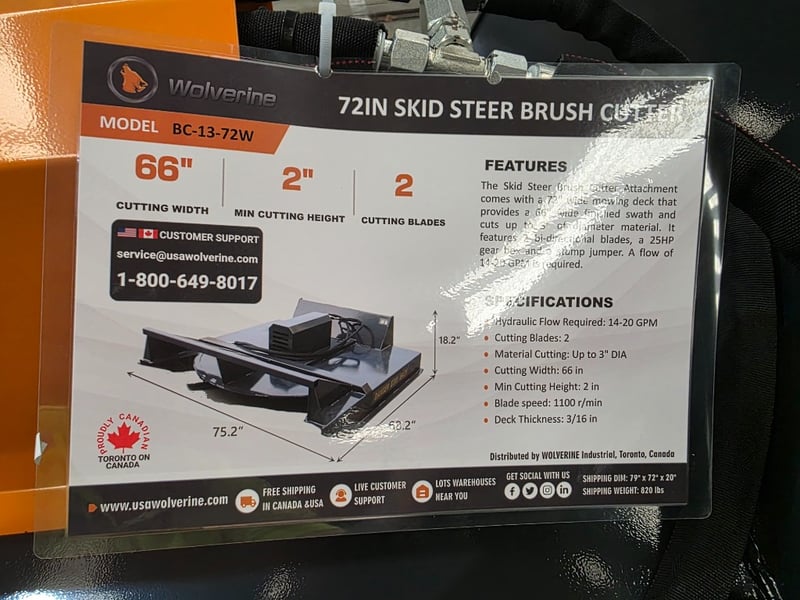 FACTORY DIRECT ** Unused 2026 WOLVERINE, Brush Cutter, BC-13-72WSkid Steer Brush Cutter Attachment Unused 2026 Skid Steer Brush Cutter Attachment Weight: 776 lbsHydraulic Flow Required:14-20 gpmCutting Blades:2Material Cutting:Up to 3" diaCutting Width:66 inWide (Overall):72 inHeight (Overall):21.6 inMinimum Cutting Height:2 inDeck Thickness:3/16 inLength (Overall):76 inMeasurement Approx: 1920*1930*480Weight Approx: 352 kgBID PER EACHPlease note: minor scuffs and marks may be evident For more information Contact King Cheung on 0477987576 or [email protected] *** PLEASE NOTE Collections must occur within 7 days of Auction Ending*** Note: OEM images and VIDEOS shown are for illustration purposes only, and used as a guide only, inspections highly recommended.ZTCU4518405