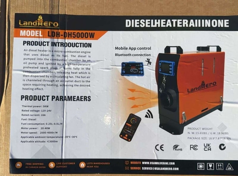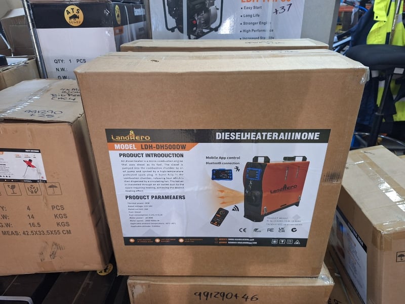 FACTORY DIRECT ** Unused 2026 LandHero, DIESEL HEATER AII IN ONE - LDH-DH5000WThermal power: 5KWRated voltage: 12V-24VRated current: 16AFuel: DieselFuel consumption:0.25L-0.5L/HMotor power: 20-40WMotor speed: 2000-4000r/MApplicable ambient temperature:-35'C~30^CApplicable altitude:<3000mSize Approx: 18.9*7.87*18.9Weight Approx: 9 kgPlease note: minor scuffs and marks may be evident For more information Contact King Cheung on 0477987576 or [email protected] *** PLEASE NOTE Collections must occur within 7 days of Auction Ending*** Note: OEM images and VIDEOS shown are for illustration purposes only, and used as a guide only, inspections highly recommended. ZTCU4518405
