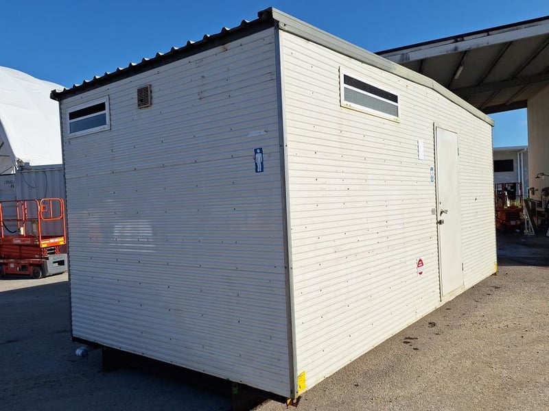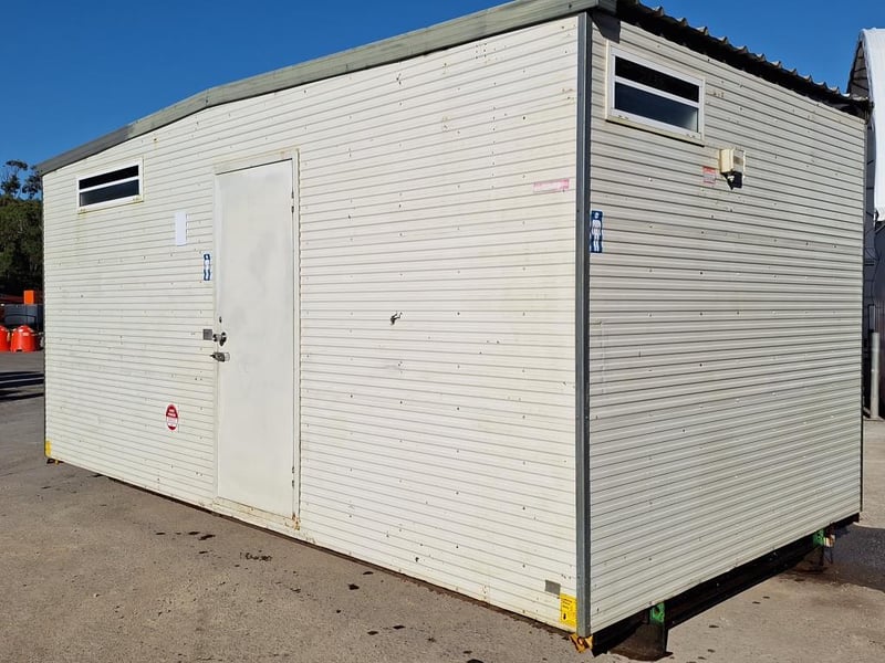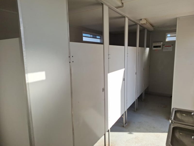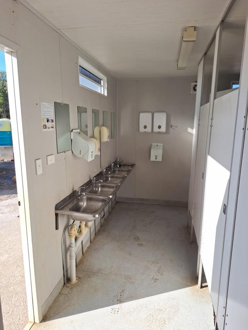 Portable Male Shower/Toilet Block Ablution 6m x 3m - Single Door - S/S Urinal - HWS - Single Shower Unit - 5 x Pan Cubicles - 5 x S/S Sinks Ref No 415601 Location: Onsite Coolum, Qld Contact: Mark David - 0437 318 344