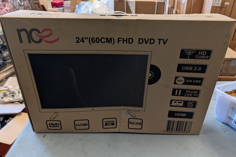 NCE 24-inch (60cm) FHD DVD TV featuring built-in HD tuner, DVD player, and digital television receiver. Unit includes USB 2.0 connectivity, recording capability via USB, pause live TV function, DC 12V power supply, and HDMI output