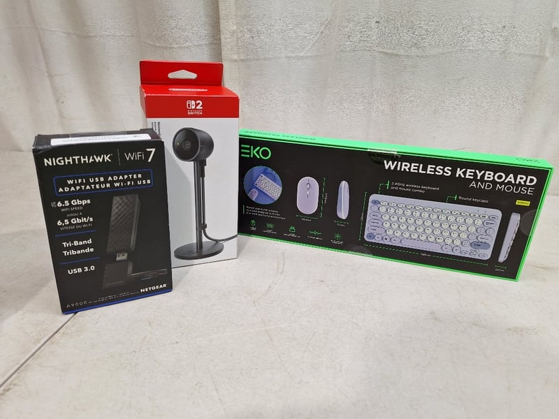 NINTENDO SWITCH 2, camera, USB cable included, factory sealed in box, NIGHTHAWK wifi 7 USB adapter, 6.5 Gbps, tri-band, factory sealed in box, EKO wireless keyboard and mouse, wireless, model: KWKMC05L, factory sealed in box
