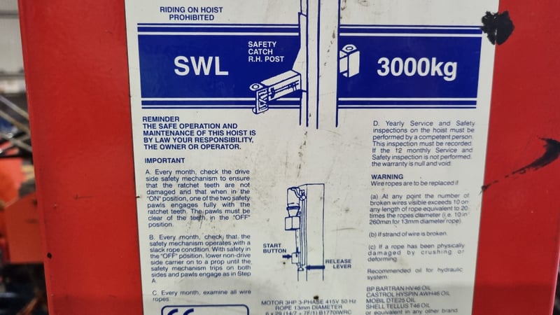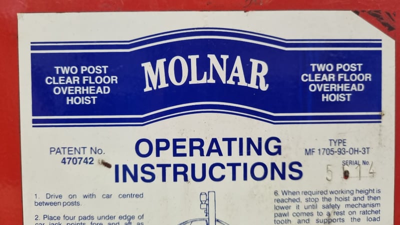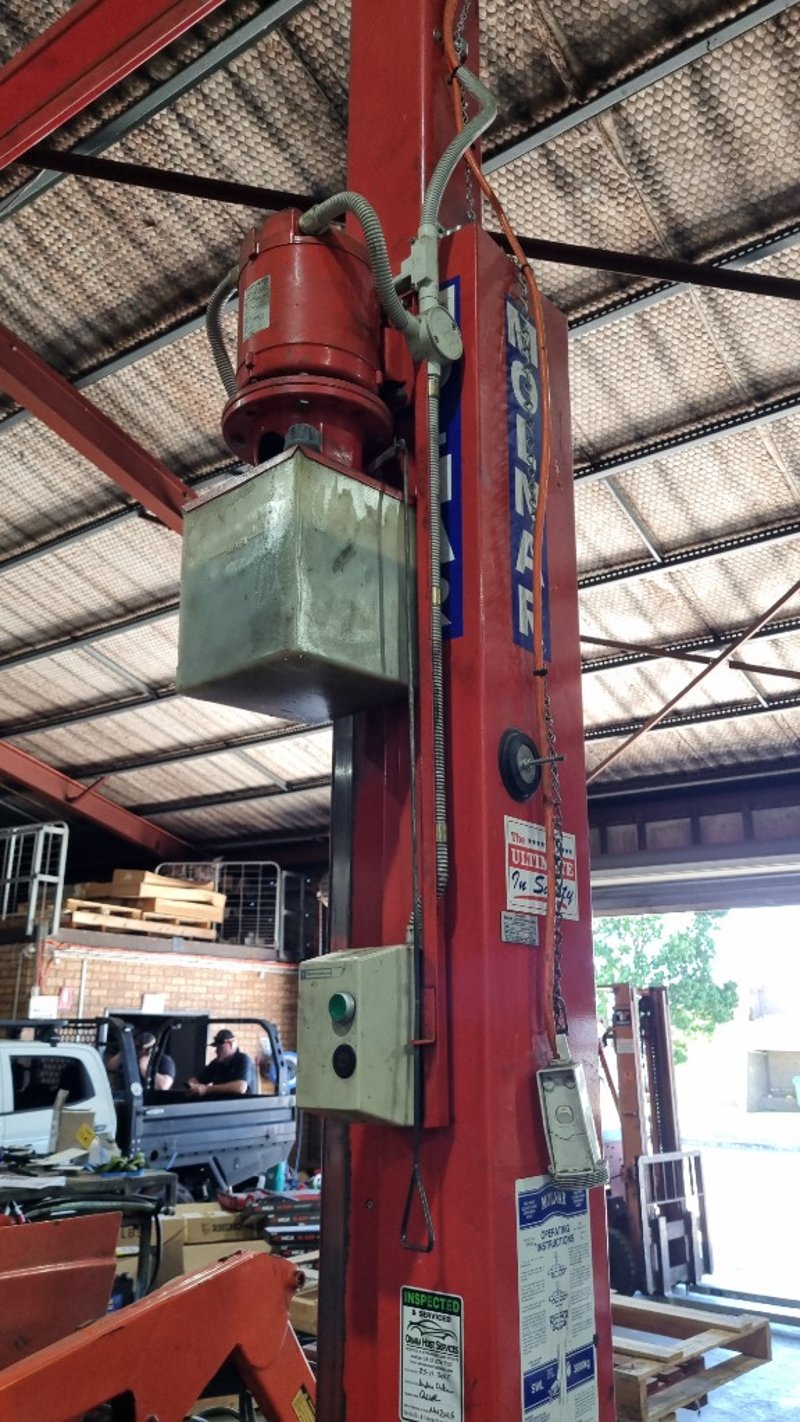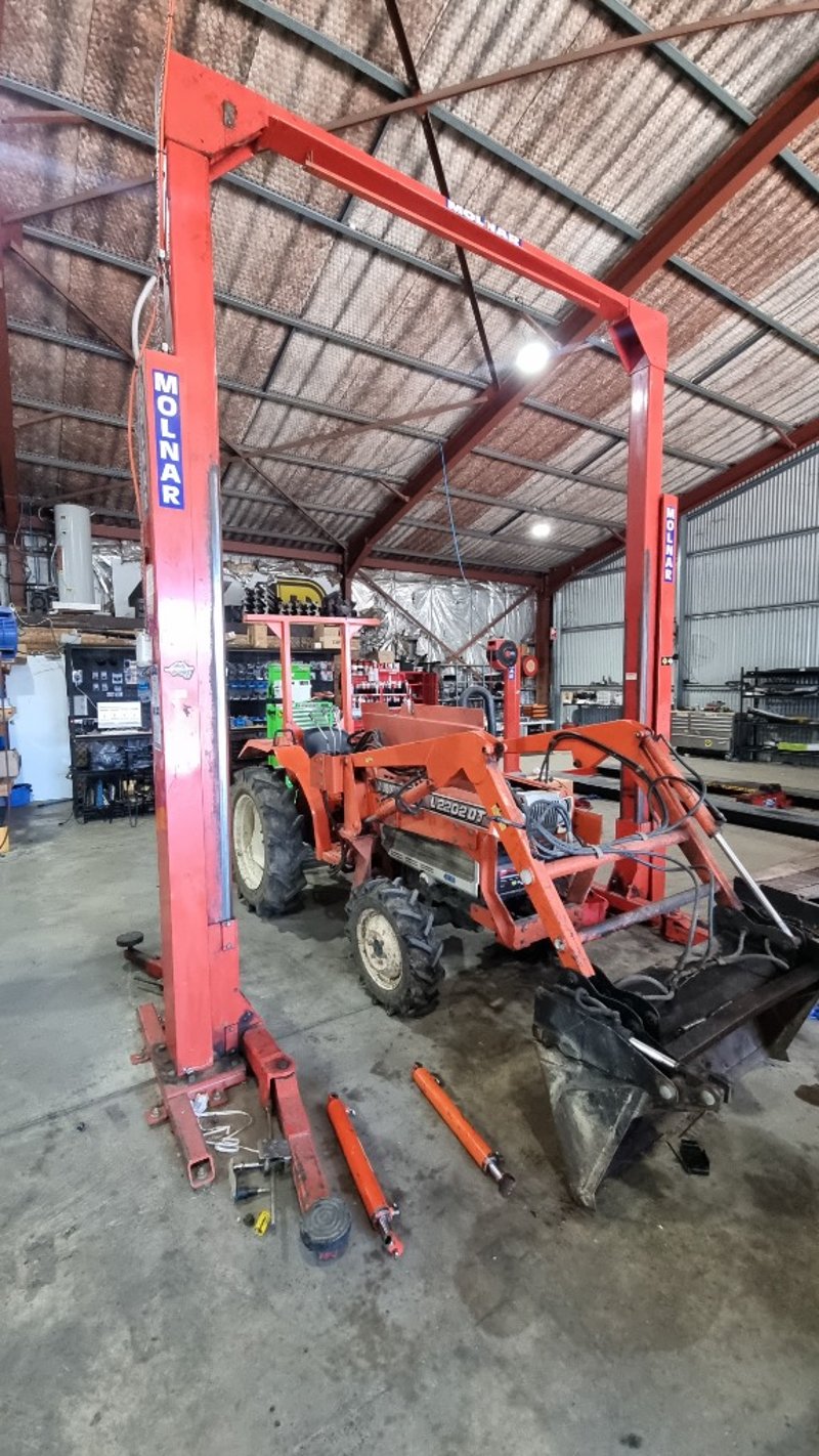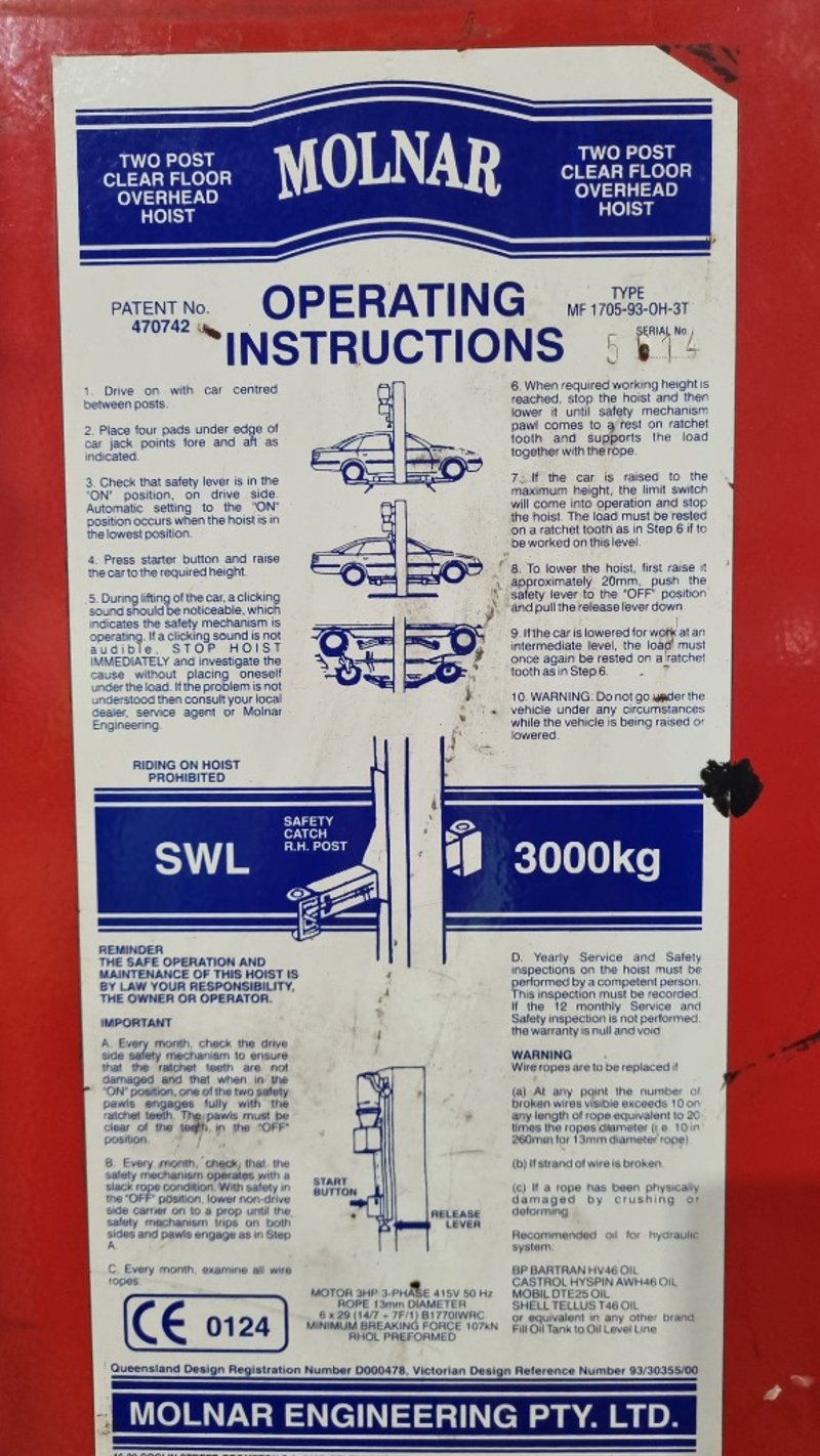 Molnar 2 post Vehicle HoistModel: MF-1705-93-OH-3TSwL: 3000kg Height 3.8mWide: 3.5m Buyer to removeNOTE: TRACTOR NOT INCLUDEDLocation: South Lismore, NSW Inspection: Wednesday 22nd of April, 9am to 3pm Collections: STRICTLY Tuesday the 28th April to Friday 1st May