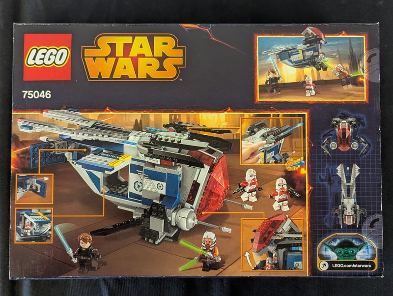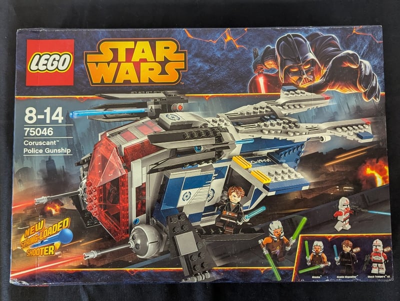Lego Star Wars Set 75046 Featuring The Coruscant Police Gunship With Newly Sprung-Loaded Shooter Mechanism. Complete With Five Minifigures Including Anakin Skywalker, Ahsoka Tano, Commander Cody, A Clone Trooper, And An Additional Police Officer. The Set Includes A Detailed Police Gunship With Rotating Cockpit, Spring-Loaded Blaster, Fold-Out Landing Gear, And An Opening Cargo Bay. Designed For Ages 8-14. Box Shows Original Retail Packaging With Illustrated Artwork Featuring Darth Vader Imagery