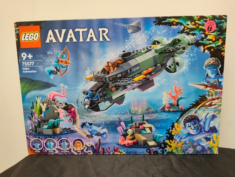 Lego Avatar Mako Submarine Set 75577 Featuring A Detailed Motorised Submarine Vessel With Dual Propellers, Minifigures Of Na'Vi Characters, Coral Reef Habitat Scenery, And Underwater Accessories. Age Rating 9+. Sealed Original Packaging With Complete Graphics Showing Assembled Model And Play Scenarios.