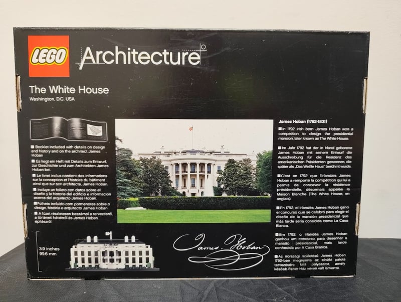 Lego Architecture Set 21006 Featuring A Detailed Architectural Model Of The White House In Washington, D.C. Usa. This 12+ Age-Rated Set Includes A Comprehensive Booklet With Historical Information And Design Details About Architect James Hoben And The Iconic Presidential Residence. The Model Showcases The Distinctive Neoclassical Facade With Columned Portico, Manicured Landscaping Base With Green Shrubs, And Detailed Roofline With Chimneys. Designed By Adam Reed Tucker For The Architect Series.