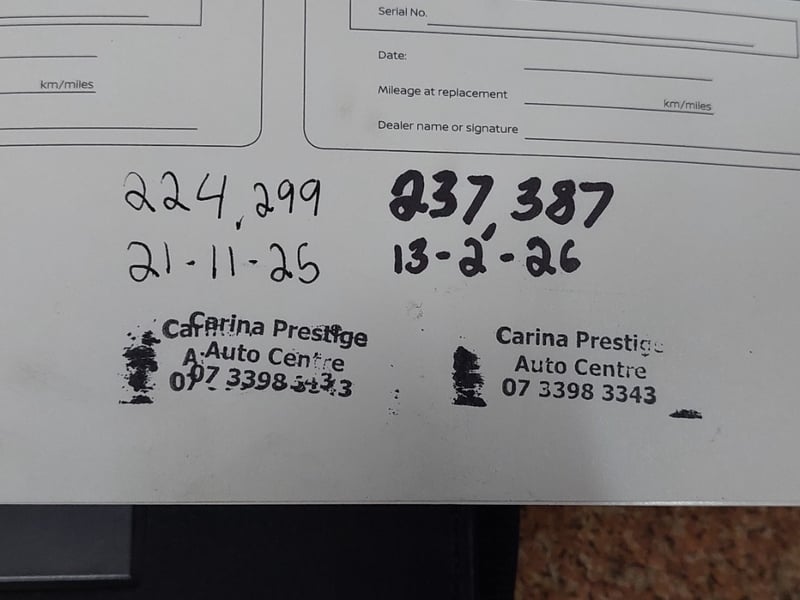 The T32 X-Trail ST is the practical choice in Nissan's family SUV range. Five seats, generous cargo space, and a straightforward front-wheel-drive drivetrain make it an accessible family vehicle. This December 2020-complied example has covered 238,456km with evidence of continued care. Service records show it was maintained at Carina Prestige Auto Centre in Brisbane in November 2025 at 224,299km and again in February 2026 at 237,387km. The vehicle went to auction having been serviced weeks prior.