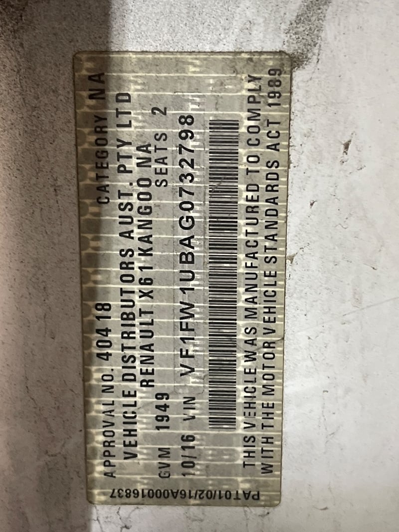 The Renault Kangoo compact van is built for city business: tight parking, reliable daily running, and a flat cargo floor that handles the workday. This X61-generation Kangoo is the 2-seat short-wheelbase cargo van variant, built in October 2016, with a GVM of 1,949 kg and a body that fits in standard bays. The sliding passenger-side cargo door and rear barn doors give flexible access to the load space. Original new pricing for this generation Kangoo was approximately $18,000-$22,000 drive-away.