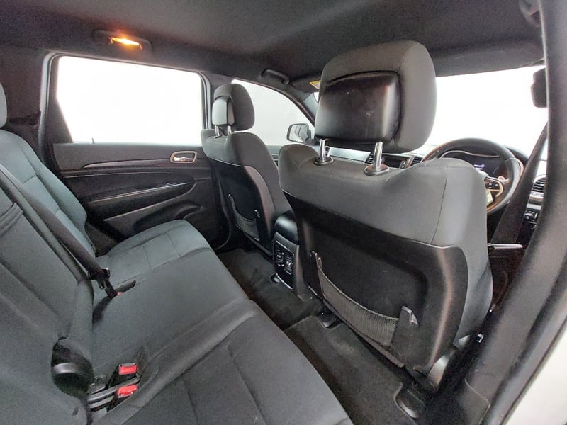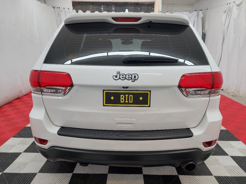 The WK2 Grand Cherokee is a commanding full-size SUV platform, and even in base Laredo trim it delivers genuine road presence at scale. This example is fitted with the Altitude appearance package, adding gloss-black alloy wheels, dark exterior badging, and blacked-out accents throughout, giving the white body a clean, contrasted look. The engine is the 3.6-litre V6 Pentastar petrol, confirmed by the VIN (engine code position 8: E = 3.6L Pentastar V6) and the Australian compliance plate which reads "JEEP GRAND CHEROKEE 4x2." Drive is to the rear wheels. Eight-speed automatic transmission.