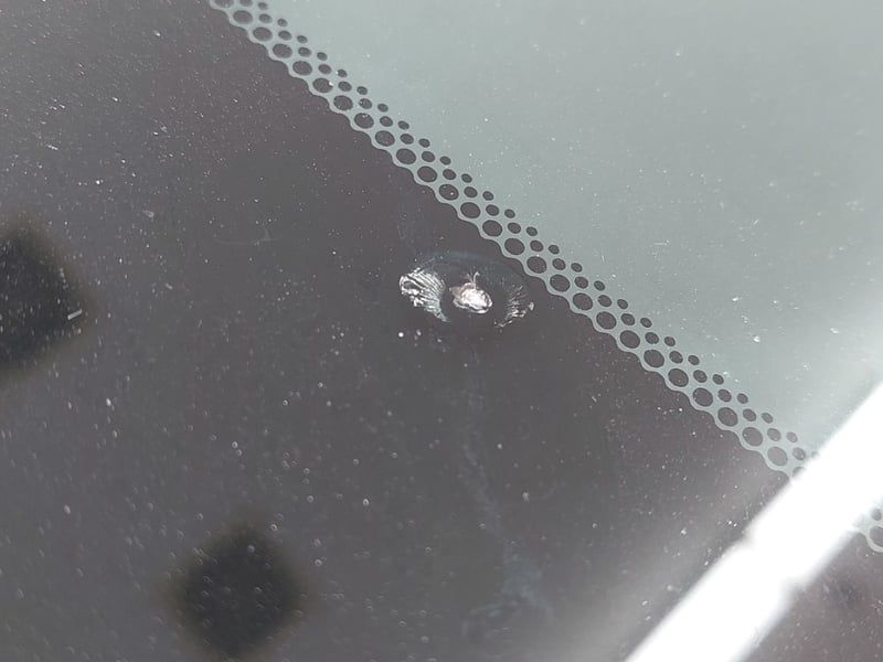 * Windshield stone chip near upper edge (small star fracture, appears filled)