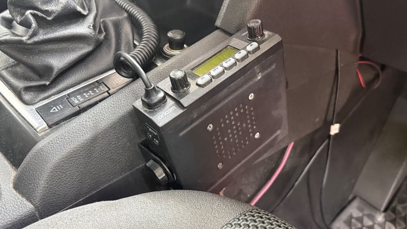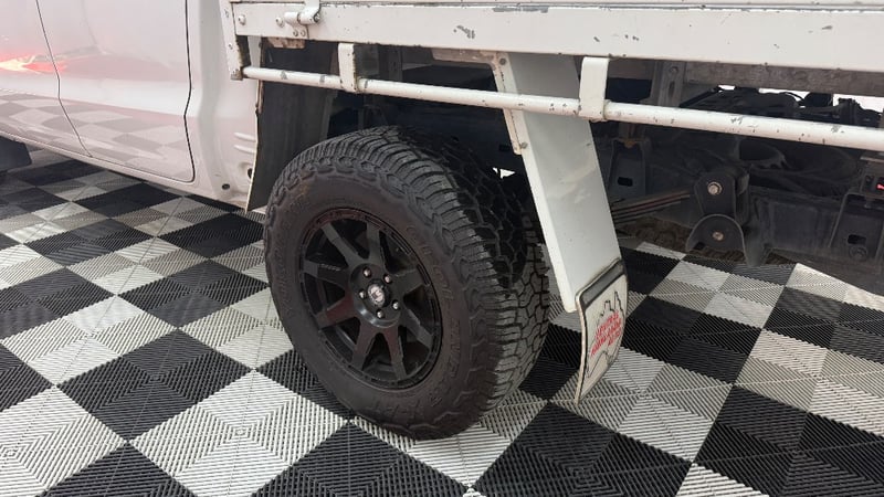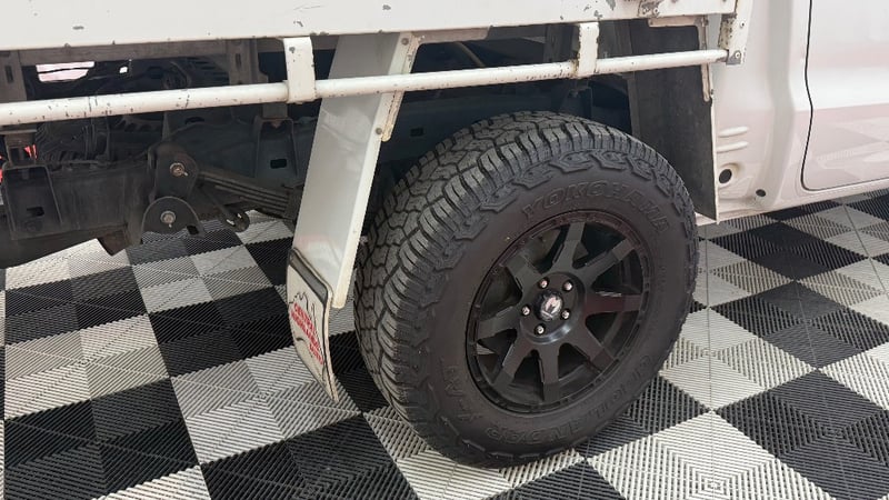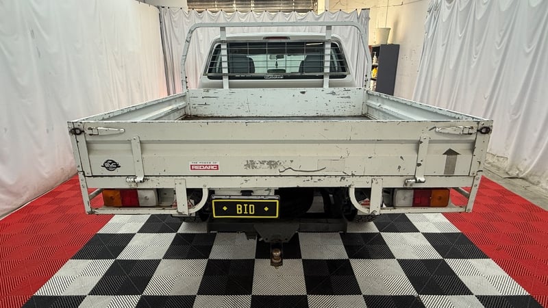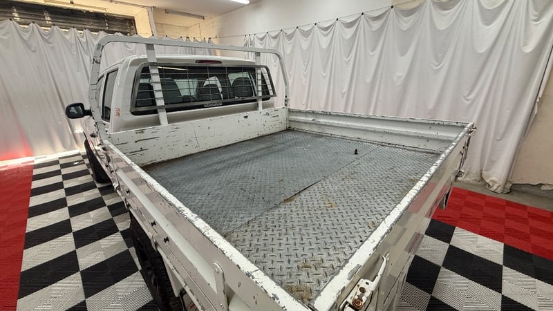 This January 2013 example is configured as a cab-chassis with an aluminum drop-side tray, steel headboard and mesh window guard. The white cab panels are in good condition. The tray shows the expected marks of genuine work use with paint chipping, scuffs, and surface wear across the tray panels. The interior is fitted with an aftermarket Android touchscreen head unit, an Oricom UHF CB radio for job site communication, and a Redarc unit. A dashmat is fitted. Black aftermarket alloys with all-terrain tyres complete the work-ready specification. An invoice from Gold Coast Diesel Specialists dated September 2025 covers a completed injector hold-down bolt repair at approximately 298,641km, a known maintenance item on the 2.0L TDI engine that has been addressed.