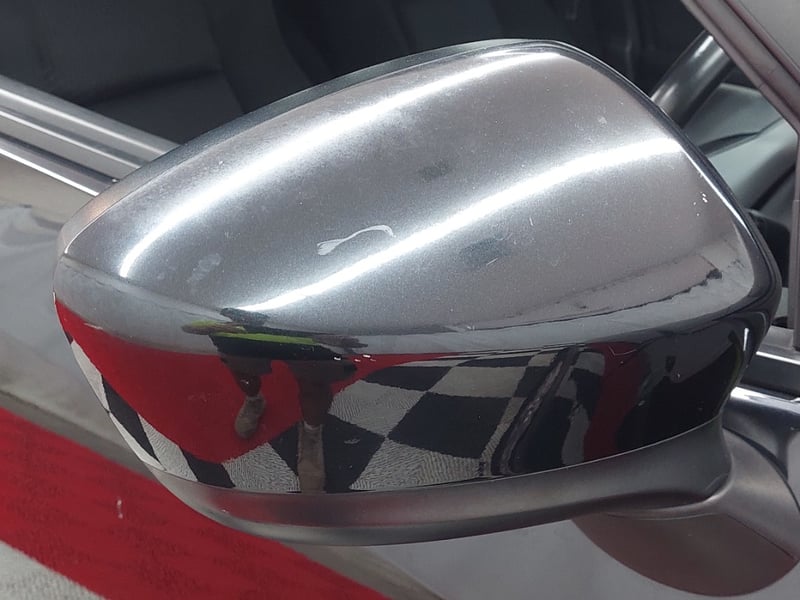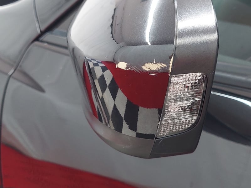 * Driver's side exterior mirror: paint peeling on the underside