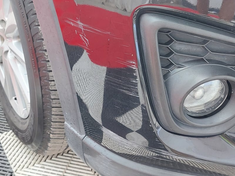 * Front bumper, driver's side corner: significant scraping with paint loss and red paint transfer visible