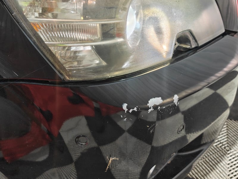 * Front bumper, passenger side: paint flaking near the headlight with primer exposed