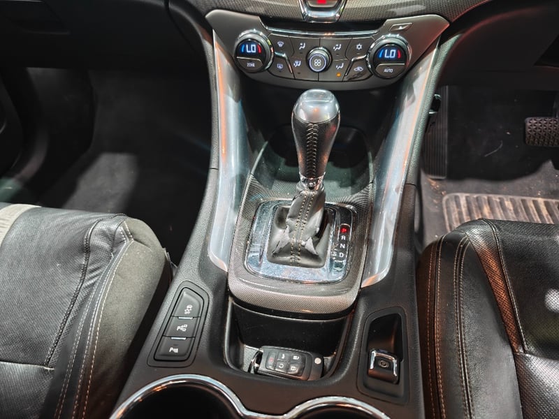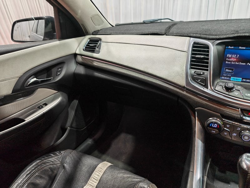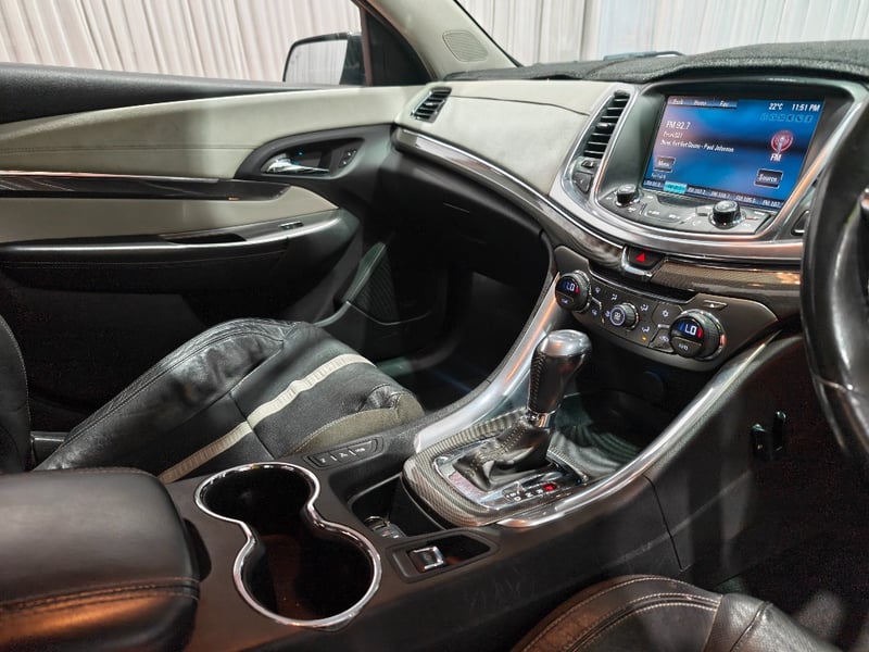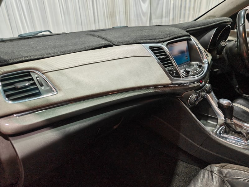 The Caprice V interior is finished in black leather with contrasting stripe inserts and features the Holden MyLink colour touchscreen infotainment system, dual-zone automatic climate control, electric front seat adjustment, a factory sunroof, rear passenger climate vents, and a reverse camera. A dash mat is fitted over the dashboard. The 6-speed automatic gear selector is conventional gate-type and appears fully functional. Cruise control is fitted.