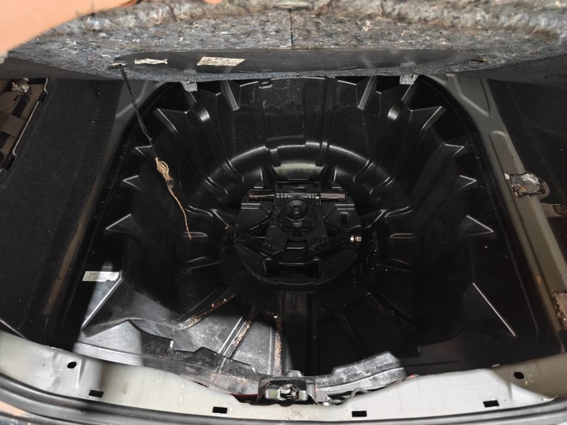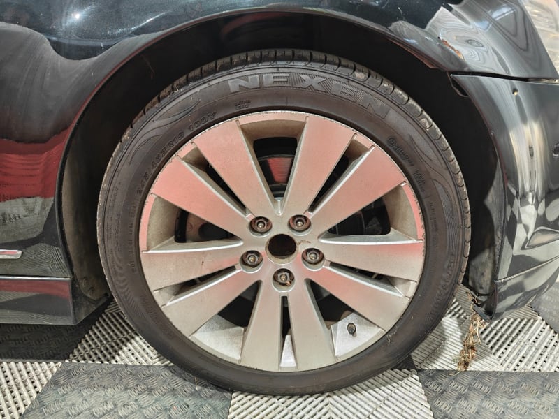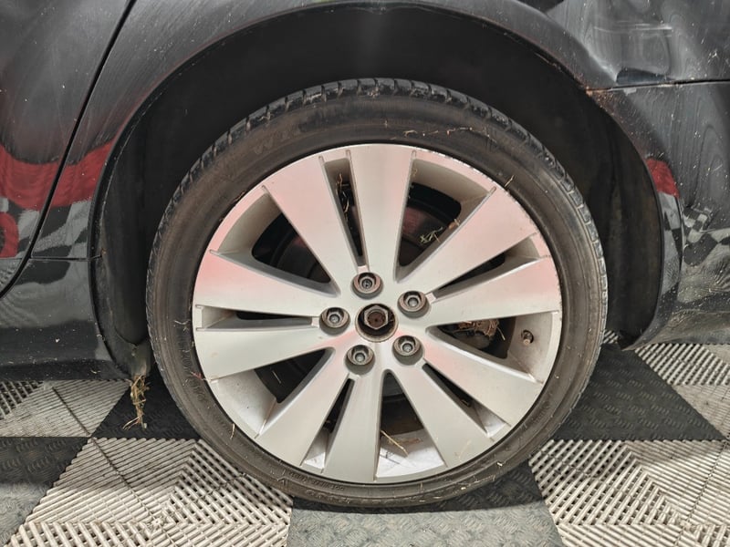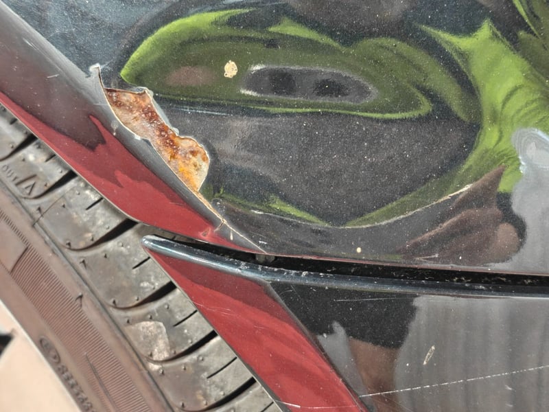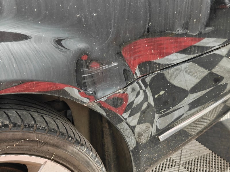 * Rear left quarter panel: visible inward dent above the wheel arch with surrounding paint scratches